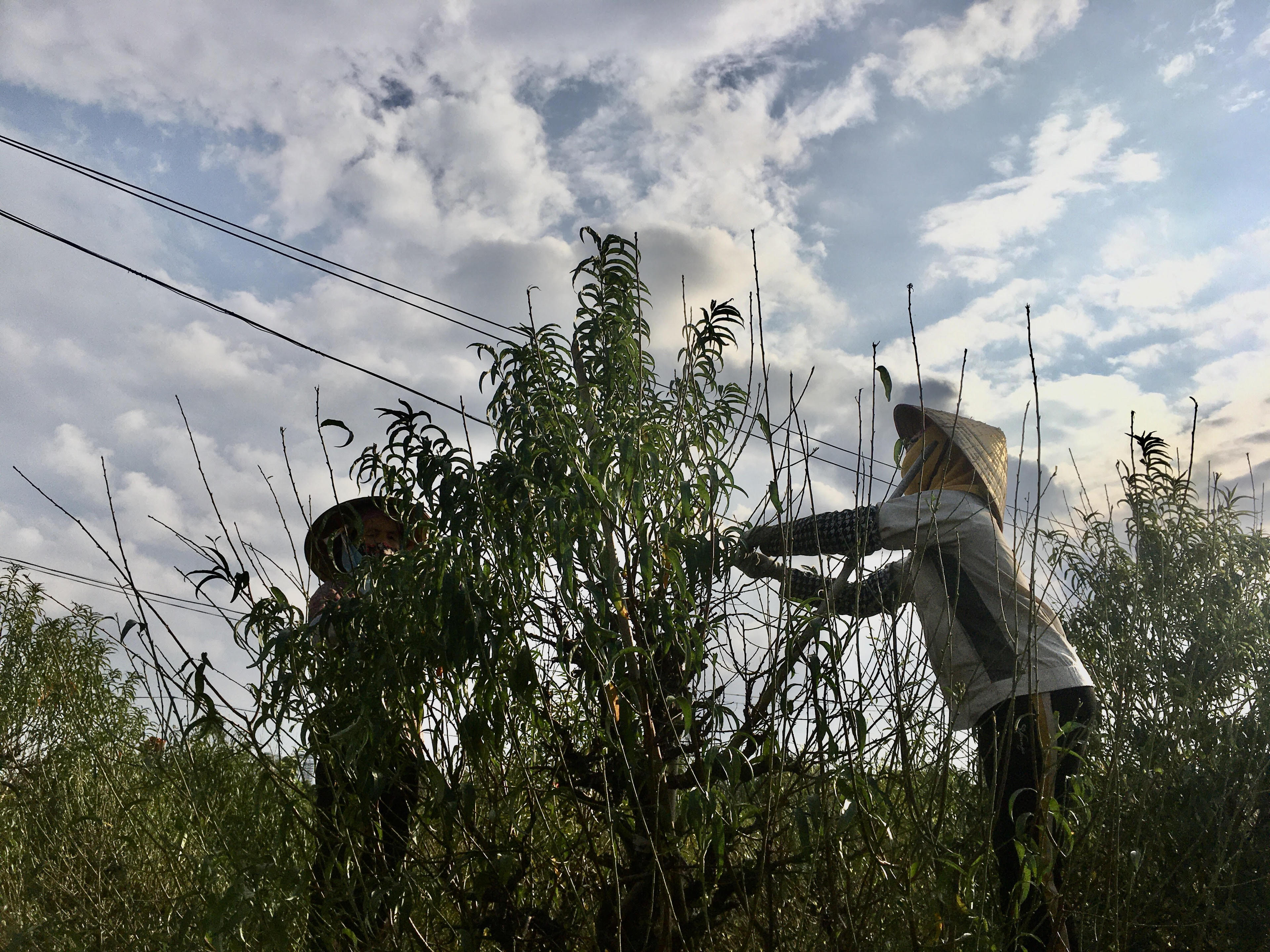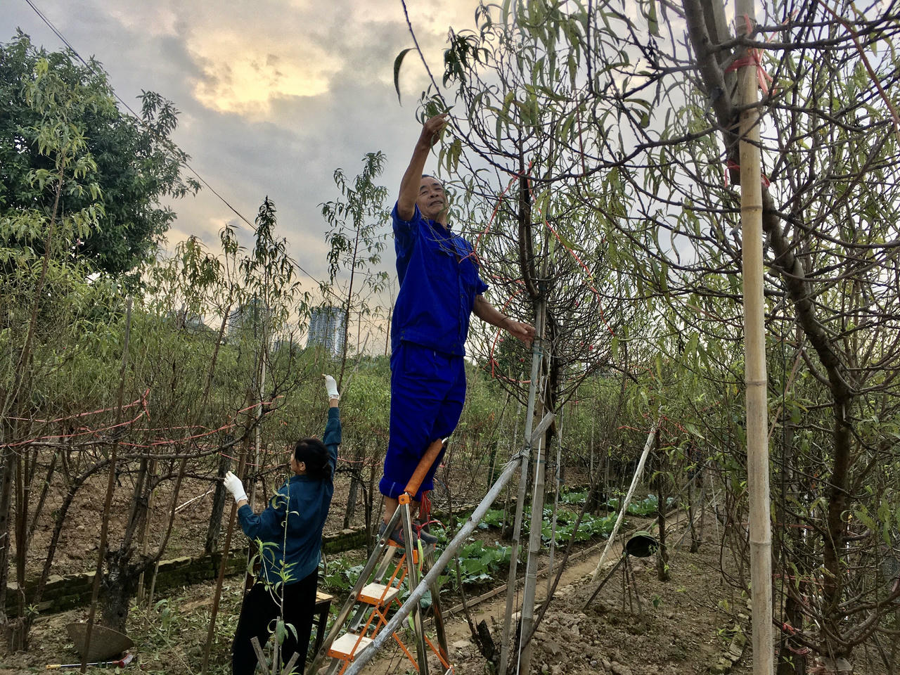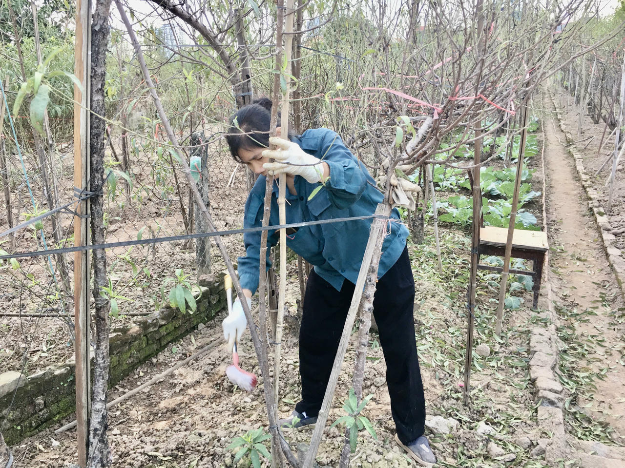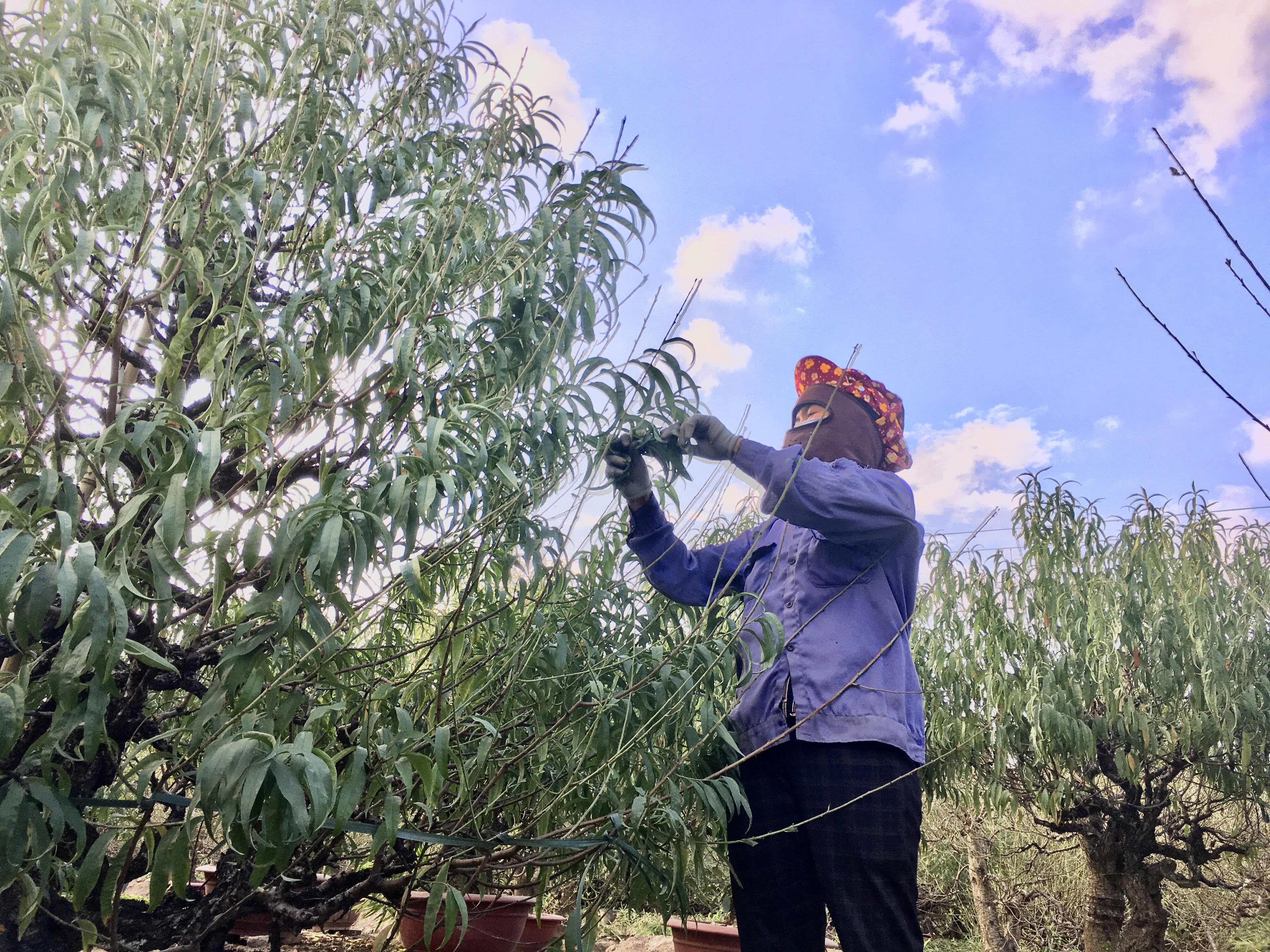 Người dân vườn đào Nhật Tân tất bật với các công đoạn phục vụ mùa quan trọng nhất trong năm. |
