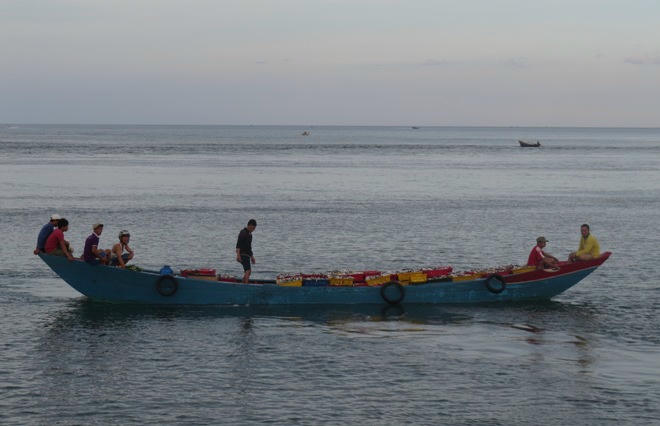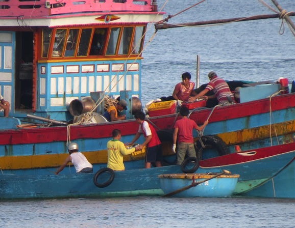 Thuyền trưởng Hoàng cho biết, khoang tàu chứa khoảng 6 tấn cá tươi và họ đang thuê ghe nhỏ của địa phương để trung chuyển cá vào cảng.