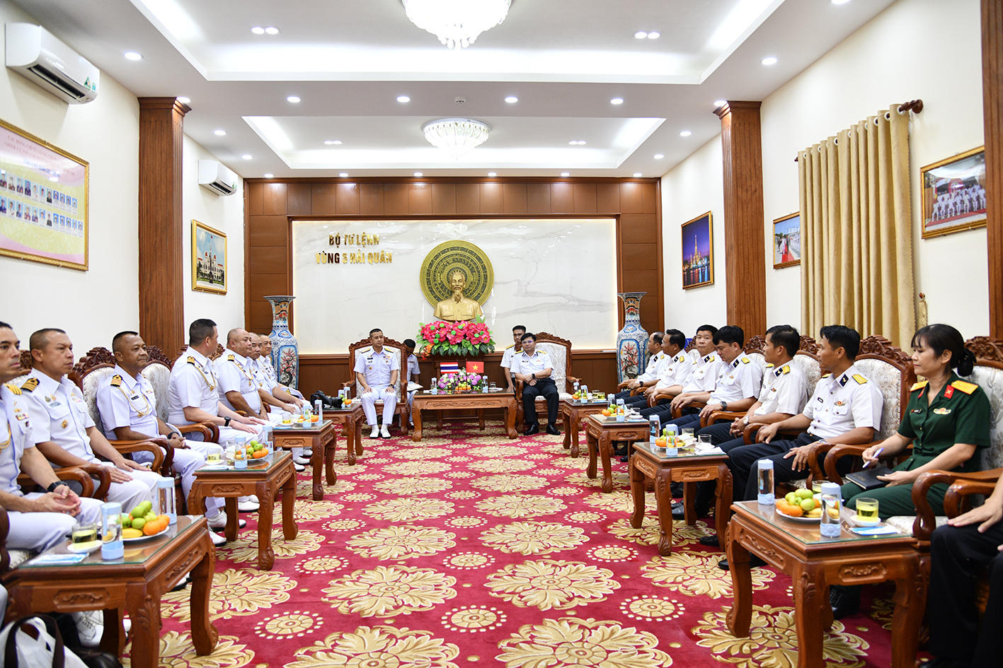 Tại buổi tiếp, Đại tá Trịnh Xuân Tùng - Tư lệnh Vùng 5 Hải quân bày tỏ vui mừng được đón đoàn công tác Hải quân Hoàng gia Thái Lan sang thăm Bộ Tư lệnh Vùng 5 Hải quân, đồng thời gửi lời thăm hỏi, chia sẻ với những thiệt hại, mất mát của người dân Thái Lan trong trận động đất vừa qua.