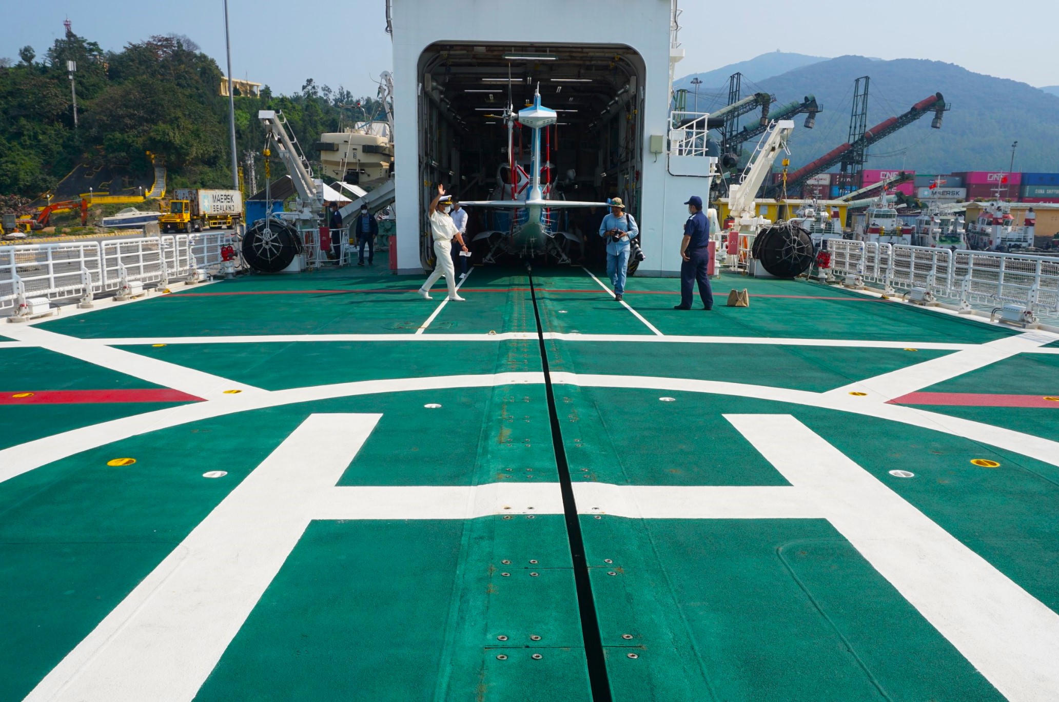 Tàu có một bãi đỗ trực thăng. |