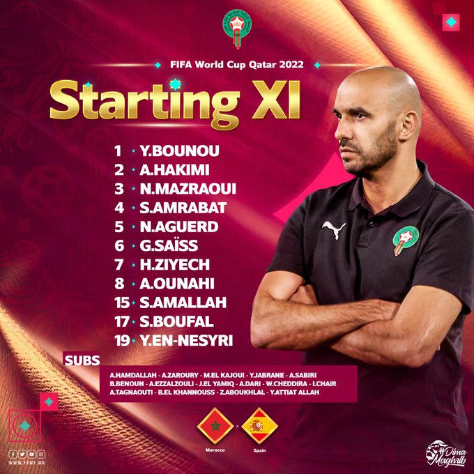 Trong khi đó, ĐT Morocco chỉ có đúng 1 sự thay đổi so với trận thắng 2-1 trước Canada ở lượt cuối vòng bảng. Theo đó, Selim Amallah đá chính thay cho Abdelhamid Sabiri.Trước trận đấu với Morocco, HLV Luis Enrique cho biết đội bóng của ông đã sẵn sàng cho những loạt sút penalty phòng trường hợp không thể giải quyết trận đấu trong 90 phút.