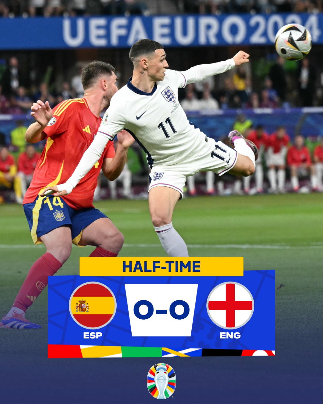 Yamal rất khó khăn, anh không thể qua mặt được Shaw. Tây Ban Nha vẫn chưa thể tìm ra đường vào cầu môn Tam sư. Phút 45, Foden dứt điểm trong tư thế với trong vòng cấm và không thắng được thủ thành Simon. Hiệp 1 kết thúc với tỷ số 0-0.