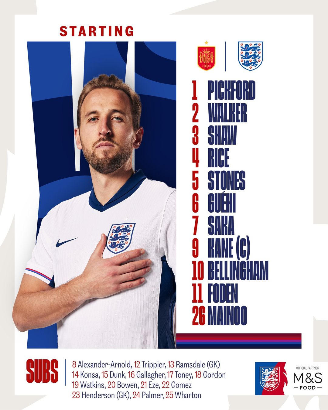 Trước Tây Ban Nha, tuyển Anh ra sân với sơ đồ 3-4-2-1. Đáng chú ý, Shaw lần đầu xuất hiện ở đội hình chính và thế chỗ vị trí của Trippier bên cánh trái. Bộ ba trung vệ của Tam sư vẫn là Guehi, Stones, Walker. Cặp tiền vệ trung tâm là Rice - Mainoo, trong khi cánh phải thuộc về Saka. Hai tiền vệ đá sau trung phong Kane như thường lệ vẫn là Foden và Bellingham.