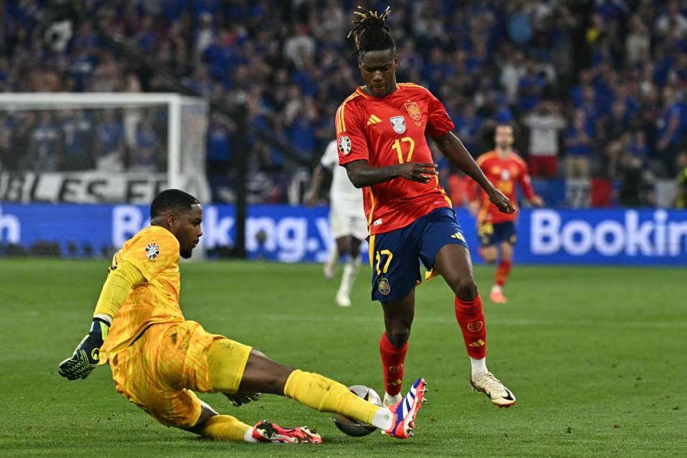 Phút 21, Yamal tung ra cú dứt điểm từ xa cực kỳ kỹ thuật đưa bóng vào góc cao khiến Maignan bất lực. Một tuyệt phẩm của EURO 2024.