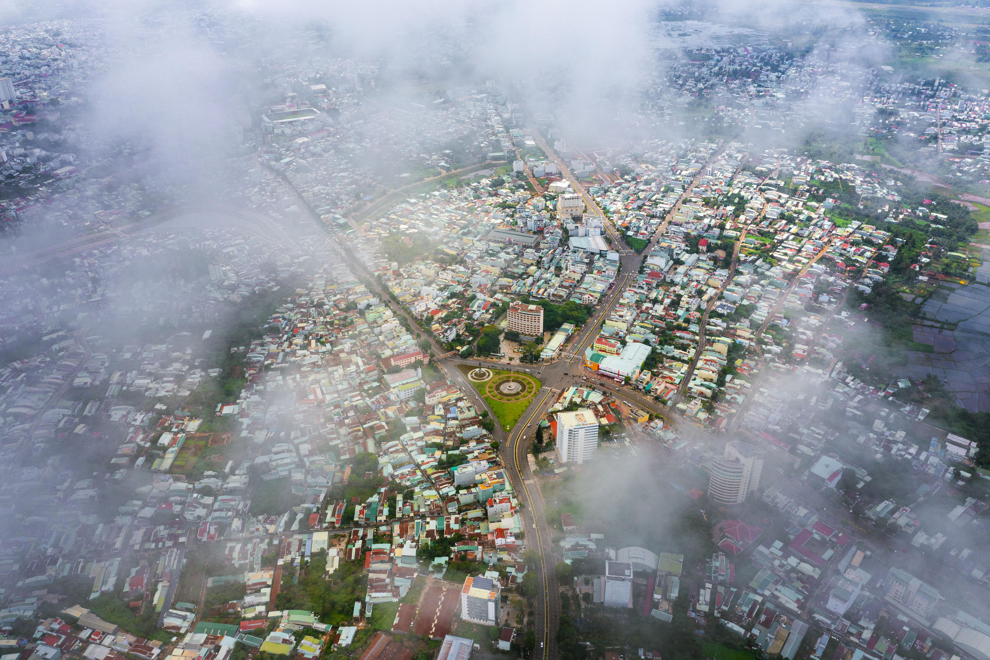 | Thành phố Pleiku nhìn từ trên cao xuống được bao bọc bởi những tầng mây. Ở đây, vào mùa mưa, chỉ cần ra khỏi nhà là bạn thấy mây ngay trước mặt. Ảnh Phạm Công Quý |