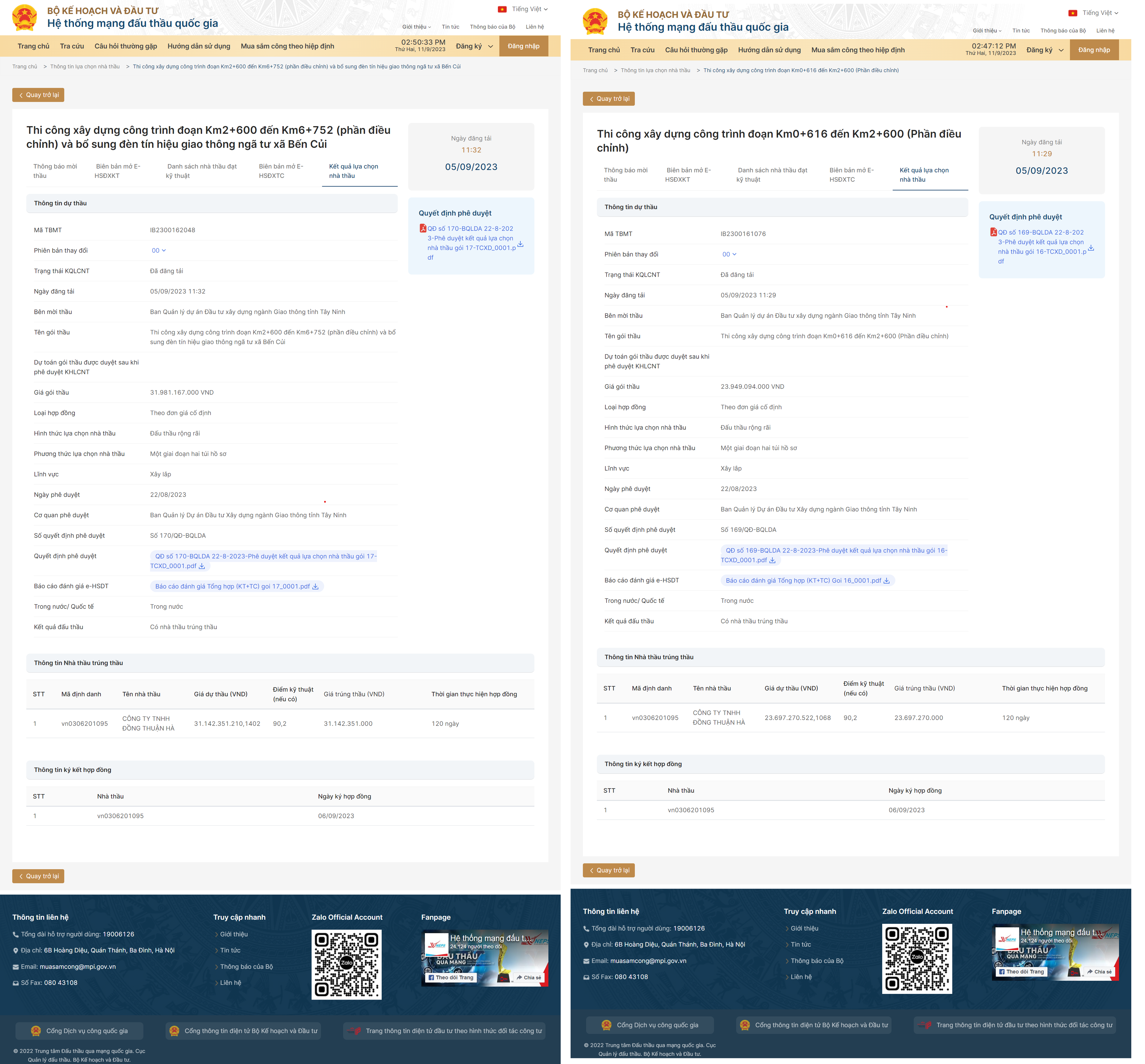 Đến ngày 22/8/2023, Ban Quản lý dự án đầu tư xây dựng ngành giao thông tỉnh Tây Ninh ban các quyết định số 169/QĐ-BQLDA, 170/QĐ-BQLDA về việc phê duyệt kết quả lựa chọn nhà thầu thi công tại 2 gói thầu nêu trên. Đáng chú ý, ở cùng một “kịch bản” thì Công ty TNHH Đồng Thuận Hà là đơn vị duy nhất tham gia và trúng cả 2 gói thầu nêu trên với mức tiết kiệm thấp.