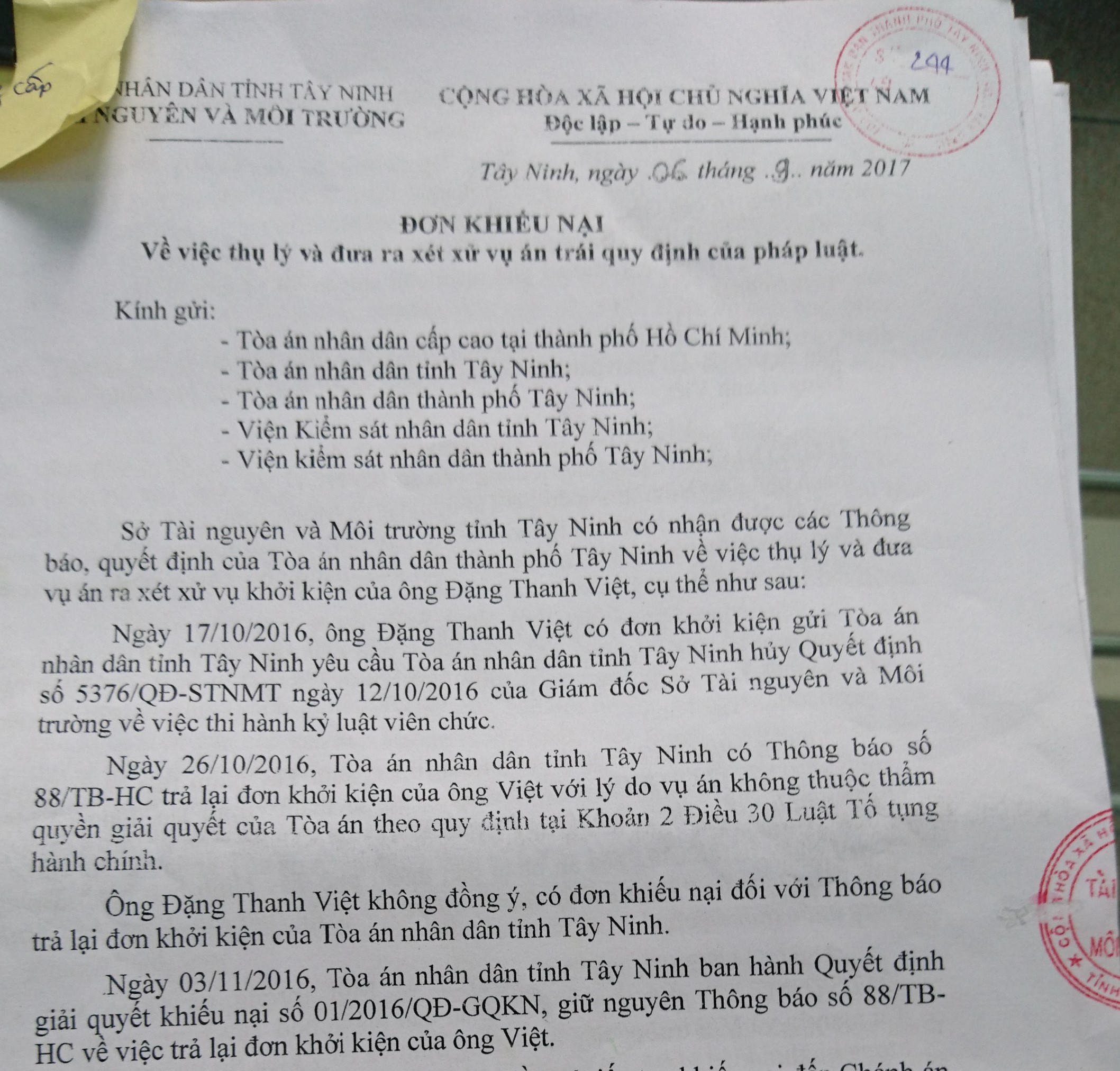 Trong thời gian tạm dừng phiên tòa, ngày 06/9/2017 Sở TN&MT lại làm “Đơn khiếu nại” kính gửi một loạt, nhiều cơ quan như: Tòa án nhân dân cấp cao tại thành phố Hồ Chí Minh, Tòa án nhân dân tỉnh Tây Ninh, TAND thành phố Tây Ninh, Viện KSND tỉnh Tây Ninh, Viện KSND thành phố Tây Ninh để yêu cầu TAND thành phố Tây Ninh ra quyết định đình chỉ vụ án, không thụ lý vụ án, đồng thời yêu cầu TAND cấp cao tại TP.HCM và TAND tỉnh Tây Ninh chỉ đạo TAND thành phố đình chỉ, trả lại đơn, không thụ lý đối với vụ khởi kiện của ông Đặng Thanh Việt.