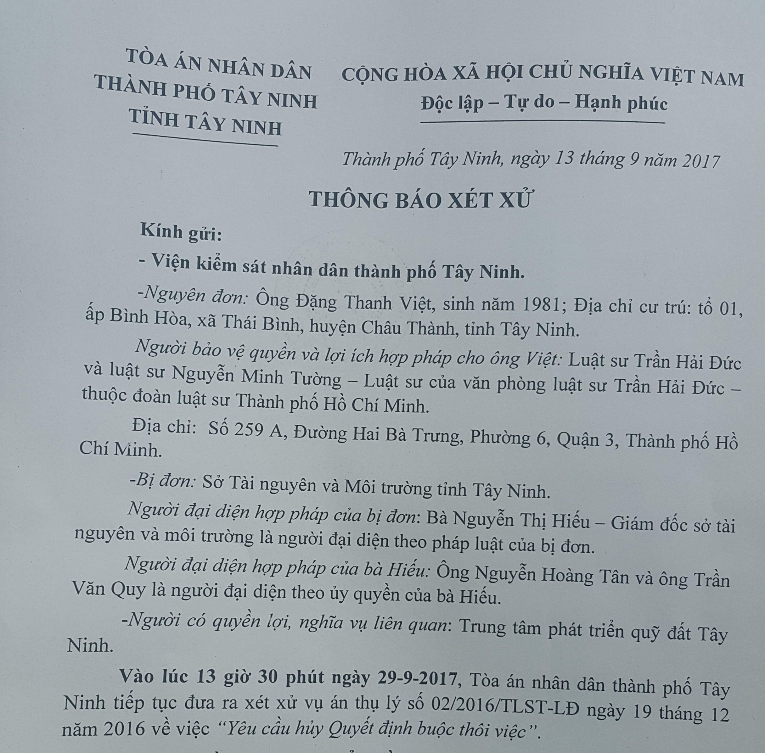 Ngày 26/10/2016 TAND tỉnh Tây Ninh có Thông báo số 88/TB-HC trả lại đơn kiện của ông Việt với lý do vụ án không thuộc thẩm quyền của tòa án theo quy định tại Khoản 2 Điều 30 của Luật tố tụng hành chính. Ông Việt khiếu nại thì TAND tỉnh ra Quyết định giải quyết khiếu nại số 01/2016/QĐ-GQKN giữ nguyên Thông báo số 88/TB-HC ngày 26/10/2016.