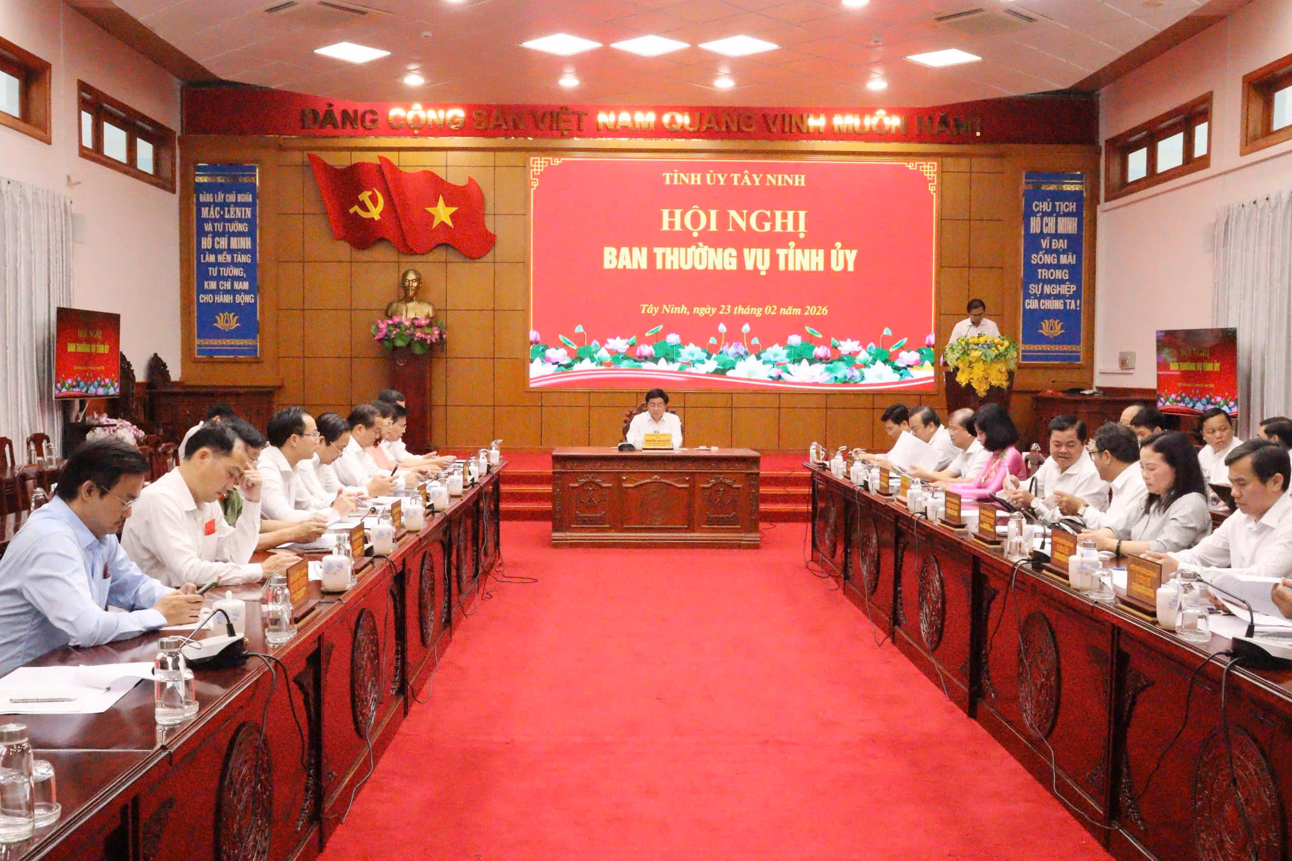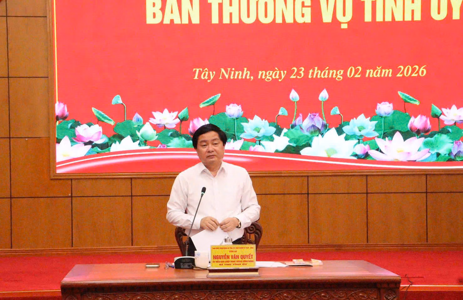Ngày 23/2, Ban Thường vụ Tỉnh ủy Tây Ninh tổ chức Hội nghị nghe báo cáo tình hình Tết Nguyên đán Bính Ngọ năm 2026 và thảo luận, xác định các nhiệm vụ trọng tâm cần tập trung triển khai trong thời gian tới. Hội nghị do ông Nguyễn Văn Quyết - Bí thư Tỉnh ủy chủ trì.