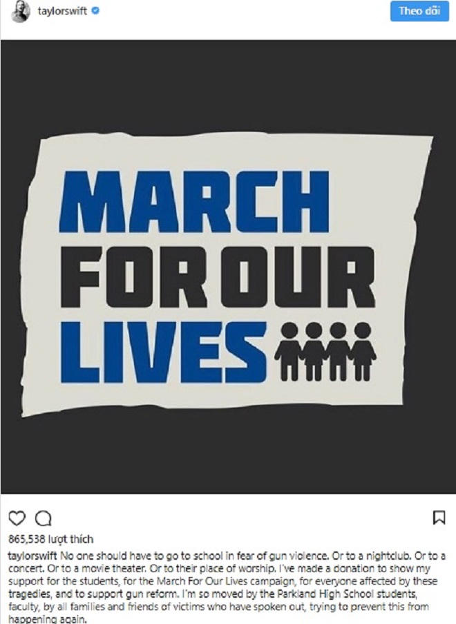 Trong một dòng trạng thái trên mạng xã hội được chia sẻ vào chiều 23/3, nữ ca sĩ Reputation cho biết cô ủng hộ các sinh viên và các nhà tổ chức của cuộc mít tinh “March for Our Lives” diễn ra tại các thành phố trên khắp nước Mỹ vào ngày 24/ 3.