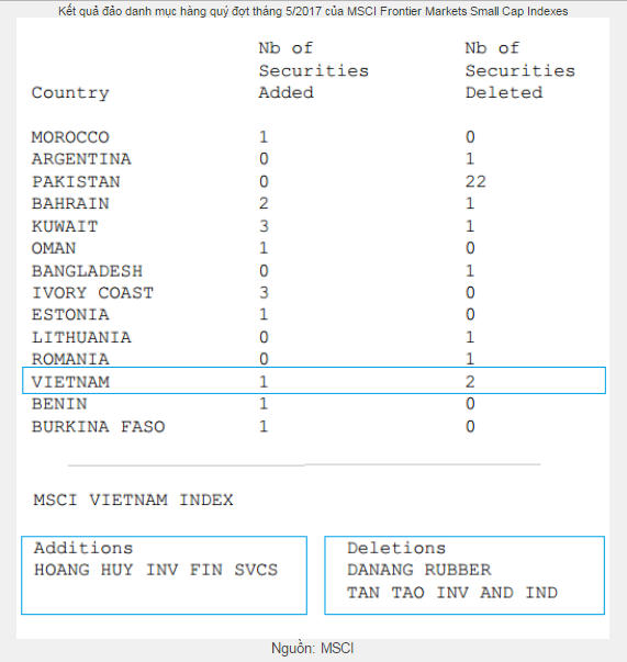 Tại kỳ đảo danh mục trước đó vào tháng 2/2017, MSCI Frontier Markets Index đã thêm duy nhất 2 cổ phiếu Việt Nam là ROS và SAB, còn MSCI Frontier Markets Small Cap Indexes không có bất kỳ thay đổi nào.