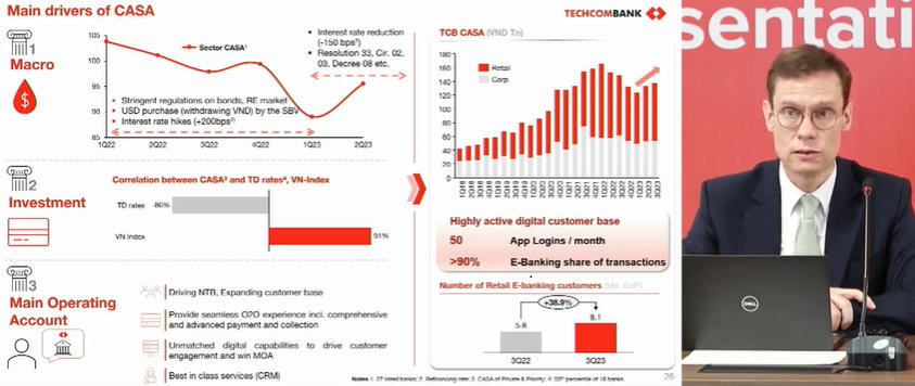 Ông Alexandre Macaire – Giams đốc đốc Tài chính tập đoàn của Techcombank dự báo: “Số dư CASA tăng với sự quay trở lại của nhiều khách hàng ở phân khúc thu nhập cao. Từ nay đến cuối năm, khi các cơ hội đầu tư trở nên rõ nét hơn, số dư và tỷ lệ CASA của Techcombank được kỳ vọng sẽ tiếp tục cải thiện”.