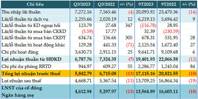 Kết quả kinh doanh quý 3 và 9 tháng đầu năm 2023 của TCB. Đvt: Tỷ đồng
