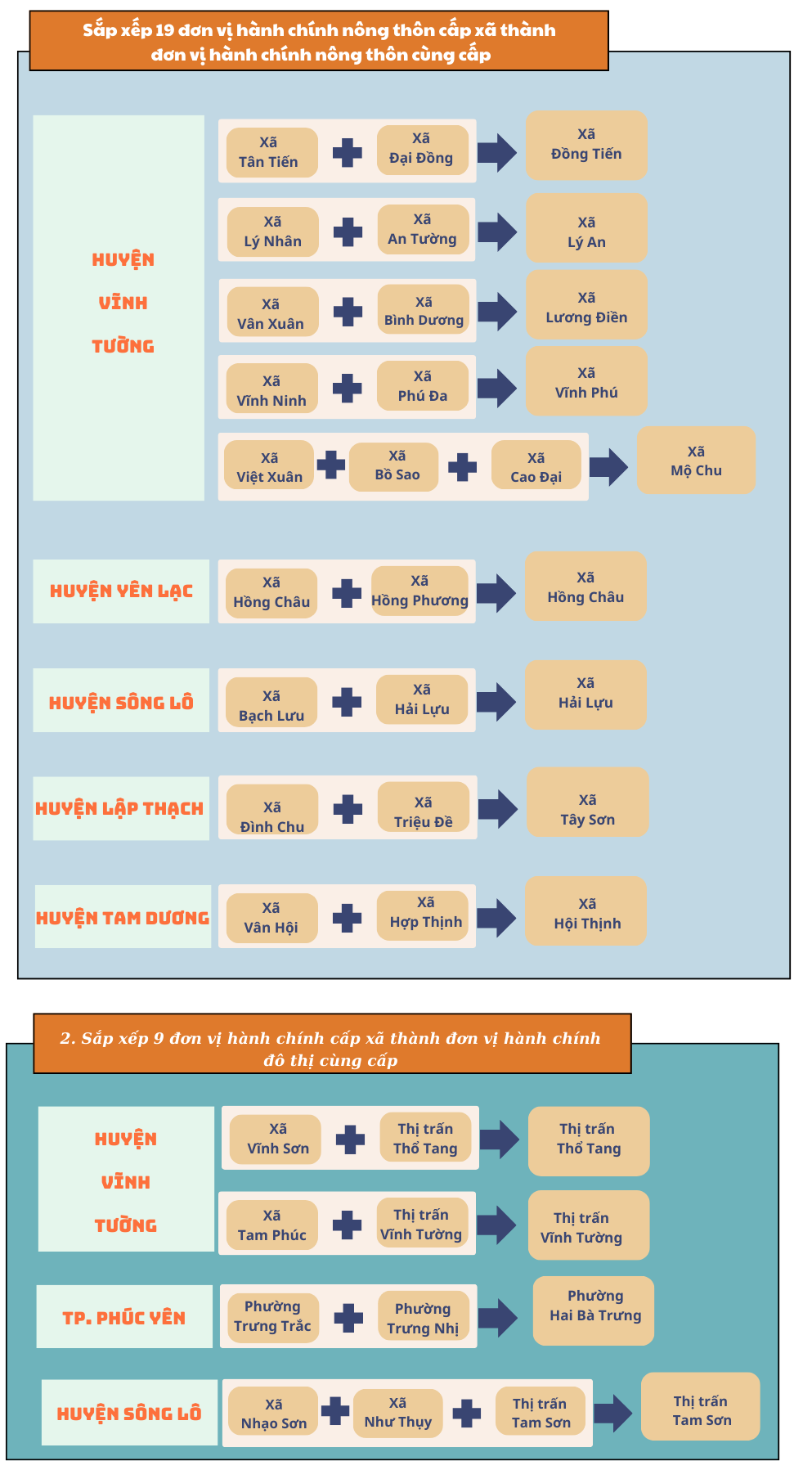 Sáp nhập xã Vĩnh Sơn vào thị trấn Thổ Tang, mang tên thị trấn Thổ Tang; xã Tam Phúc sáp nhập vào Thị trấn Vĩnh Tường, mang tên thị trấn Vĩnh Tường.