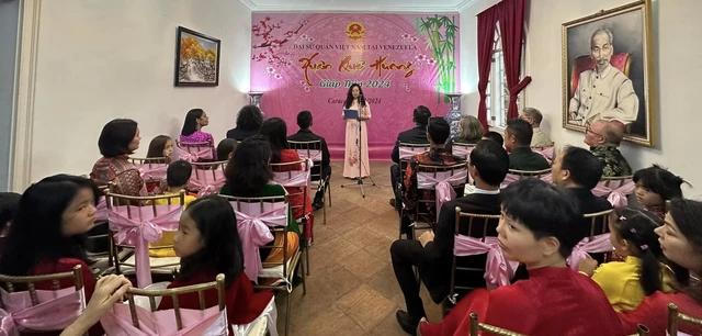 Tối 3-2, đại sứ quán ta tại Venezuela đã tổ chức Tết cộng đồng 2024. Đông đảo cán bộ nhân viên, gia đình và bạn bè cùng cộng đồng người Việt Nam tại Venezuela đã được thưởng thức những tiết mục văn nghệ đặc sắc ca ngợi Đảng, mùa xuân, đất nước; được thưởng thức hương vị các món ăn truyền thống quen thuộc của ngày Tết cổ truyền của dân tộc và những màn pháo hoa rực rỡ.