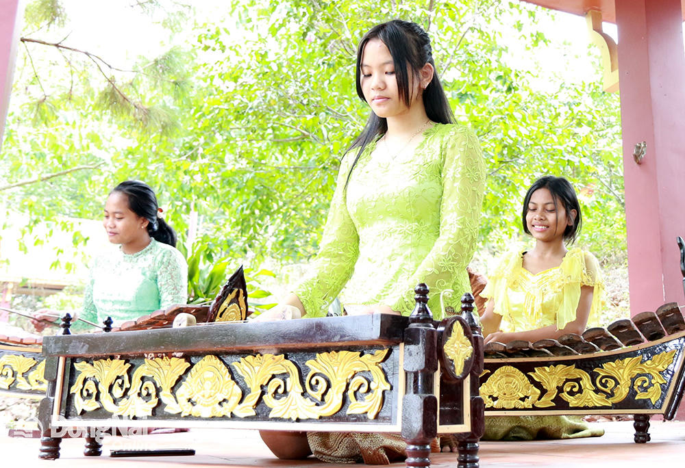 Thanh, thiếu niên đồng bào Khmer ở Định Quán, Đồng Nai tập luyện dàn nhạc ngũ âm chuẩn bị biểu diễn dịp Tết Chol Chnam Thmay 2024. (Nguồn: ĐN) |