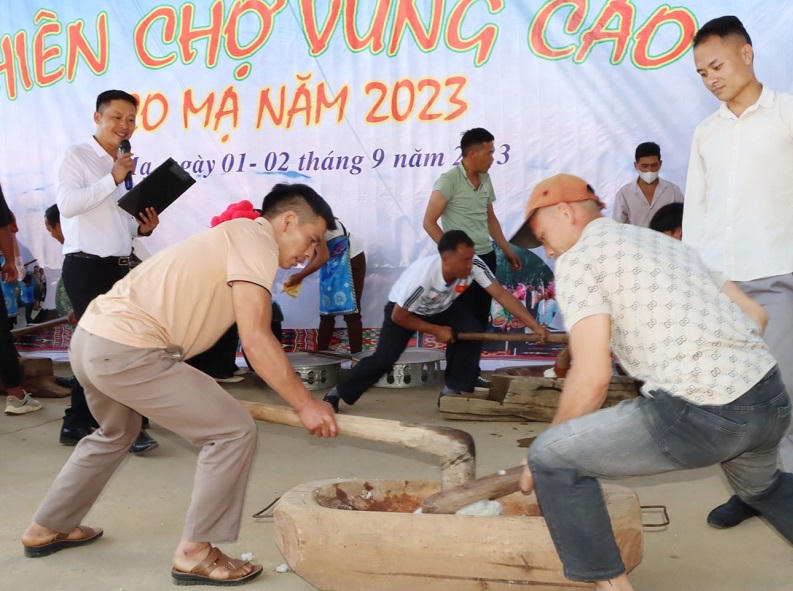 Giã bánh giày một hoạt động không thể thiếu trong ngày Tết Độc lập của người Mông. |