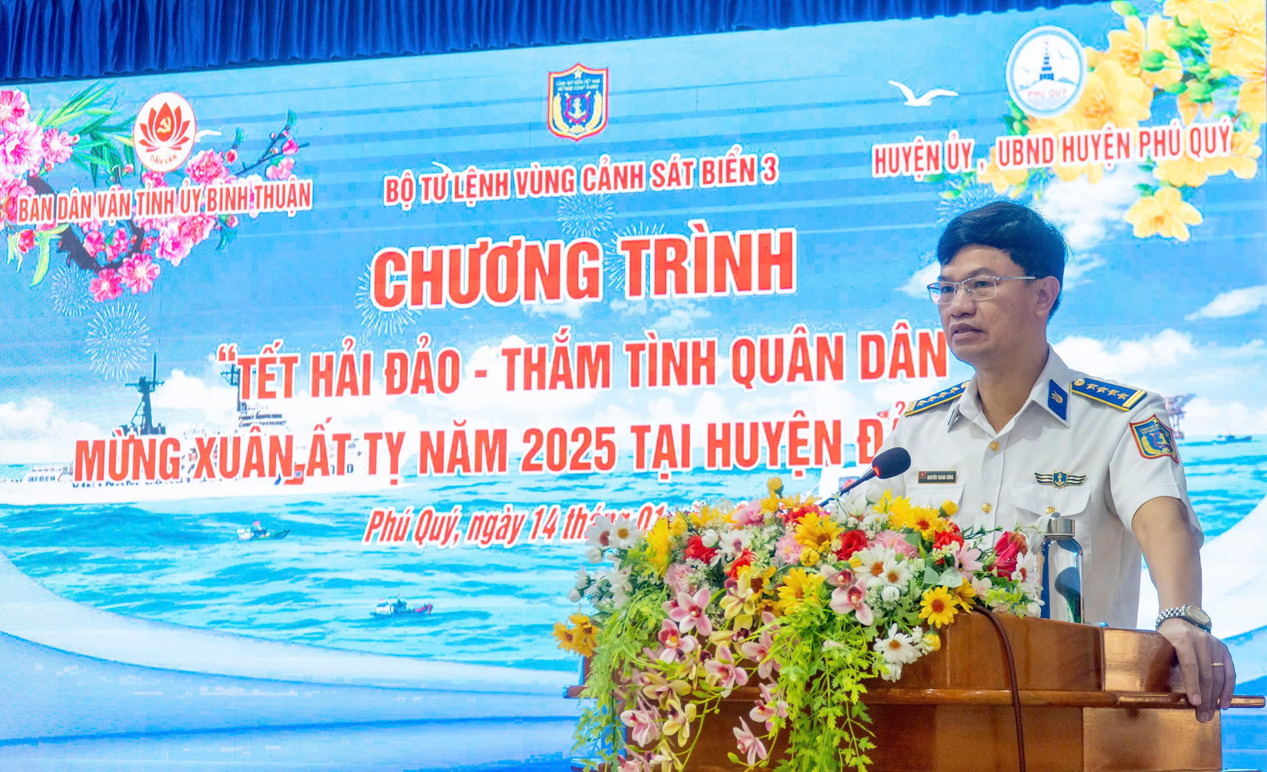 Đại tá Cao Xuân Quận, Phó Chính ủy Vùng CSB 3 phát biểu tại chương trình “Tết hải đảo - Thắm tình quân dân, đón Xuân Ất Tỵ năm 2025”. (Ảnh trong bài: Quang Toàn) |