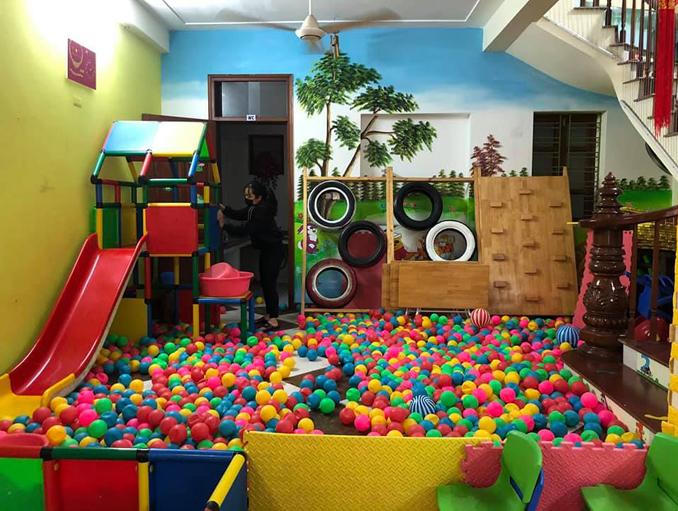 Giáo viên vệ sinh khu vực vui chơi ở một trường mầm non tư thục tại quận Hà Đông, Hà Nội, hồi tháng 5/2021.