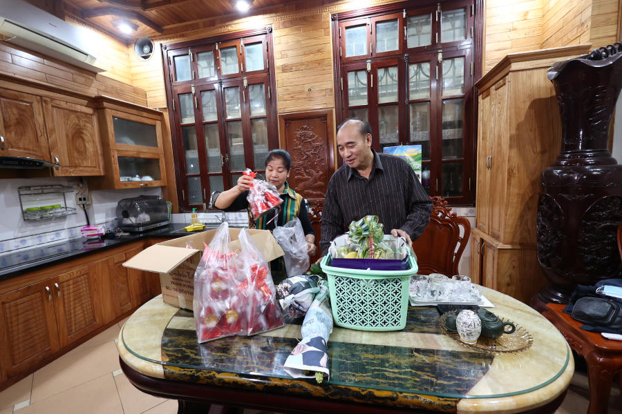 Bà Phạm Thị Điền, ông Nguyễn Hữu Thìn sửa soạn chuận bị đồ lễ cho Tết Thanh Minh. |