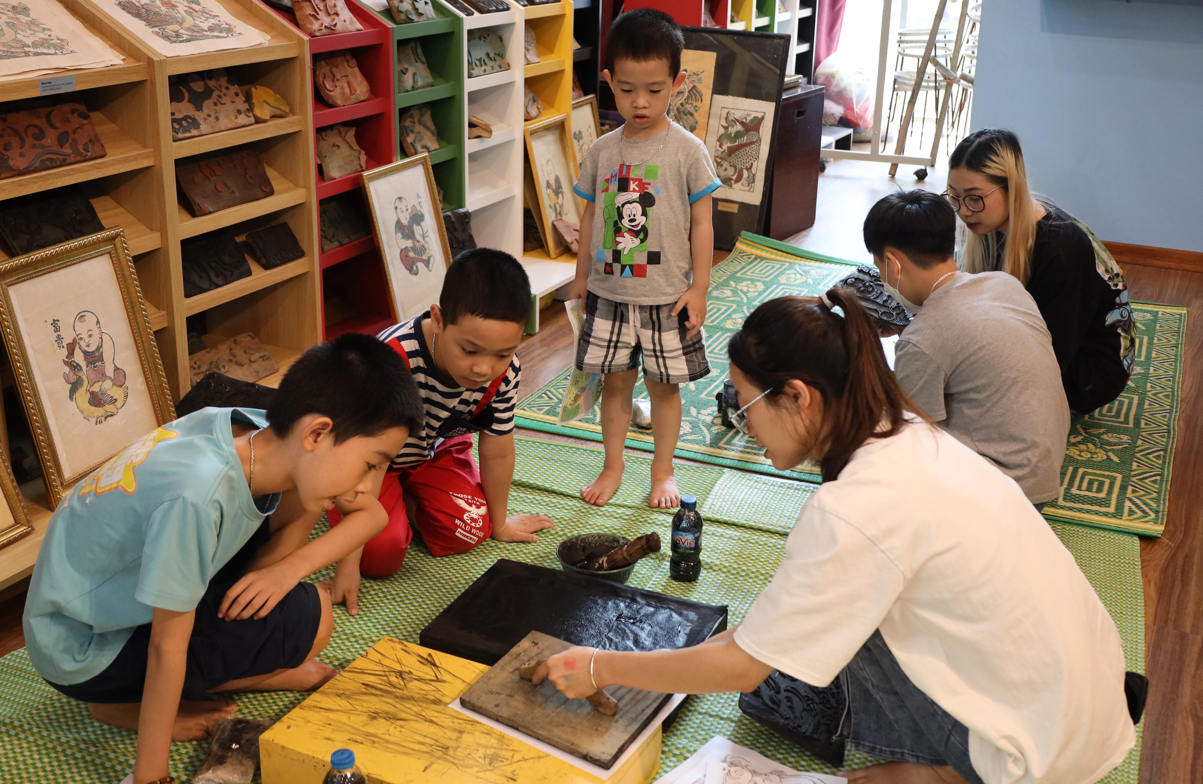 Trẻ nhỏ học cách in tranh dân gian Đông Hồ. Ảnh BTDTHVN |