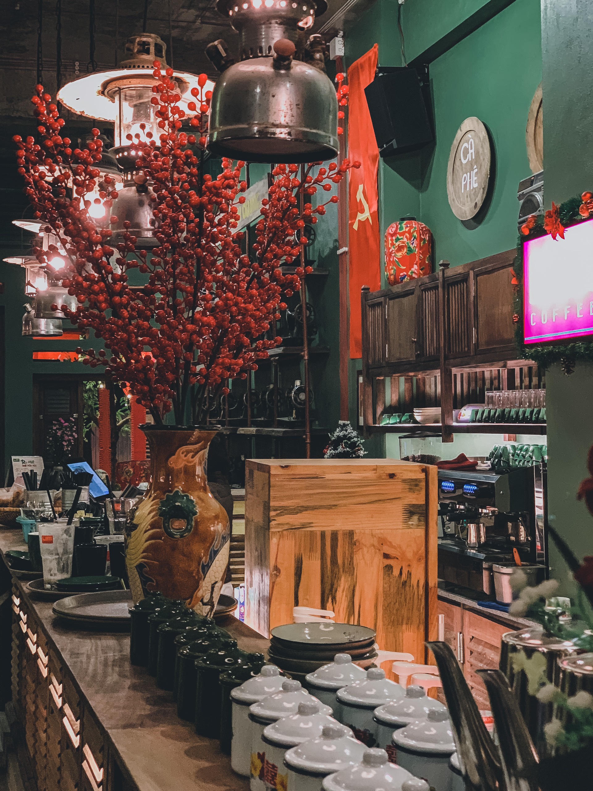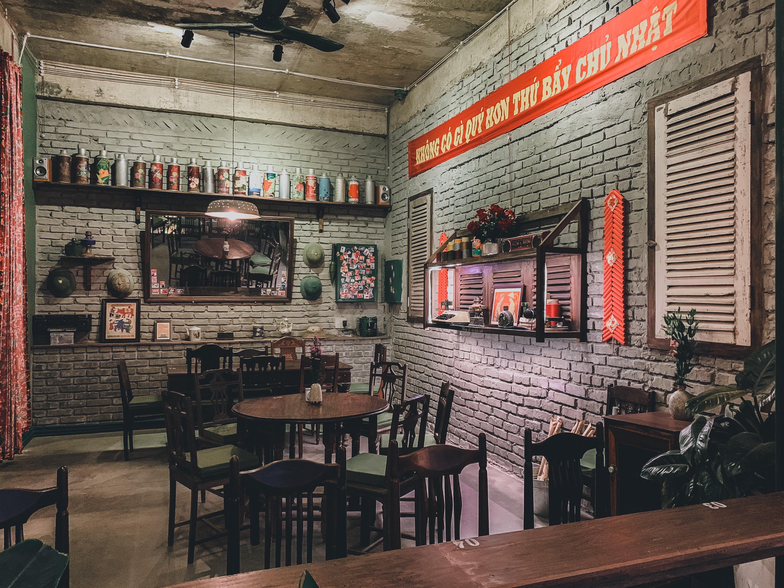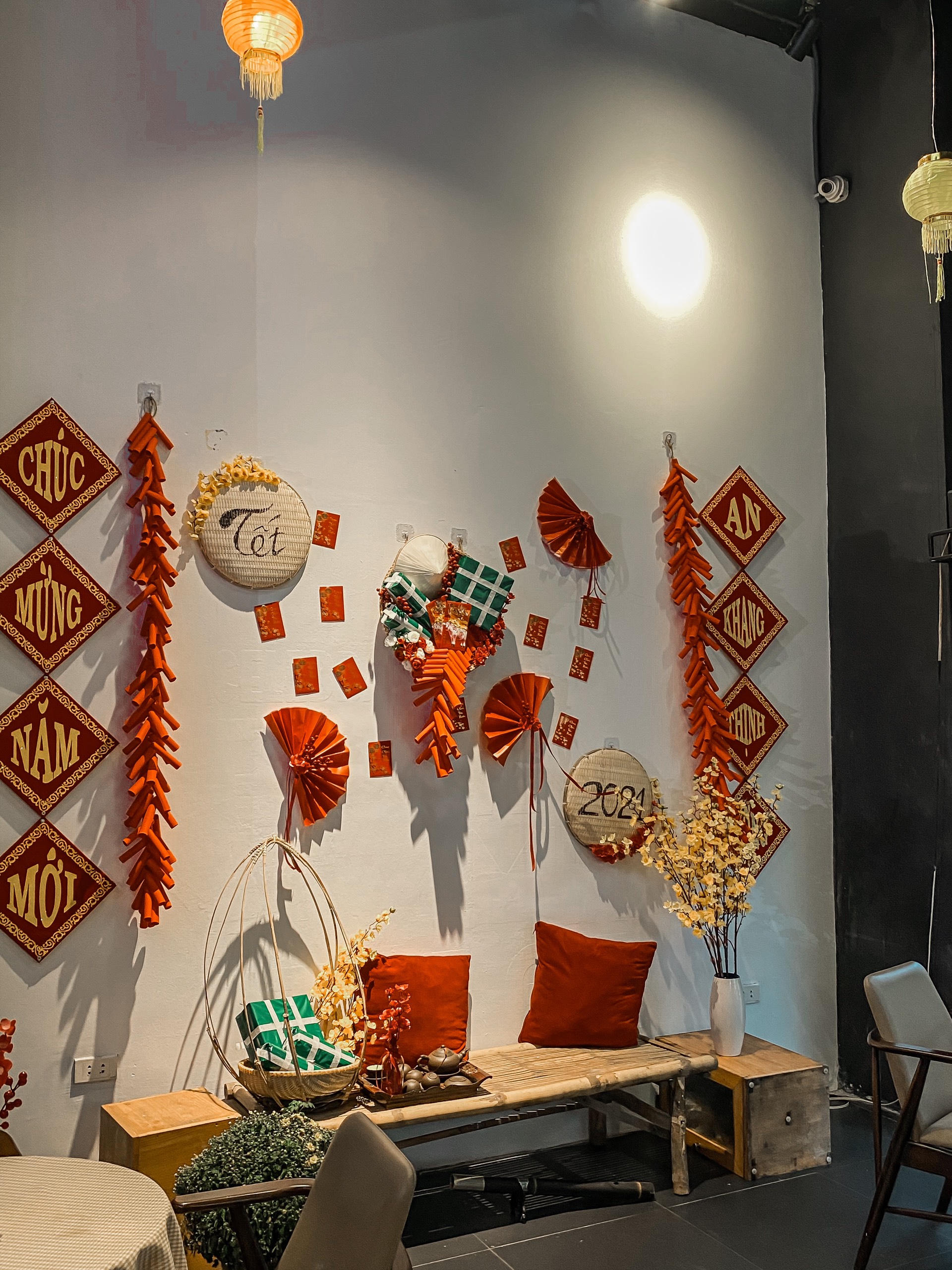 Giữa xô bồ của thành phố tấp nập, Lim là khoảng lặng bình yên cho mỗi khách hàng ghé thăm. Vốn là một quán cà phê có nét “cổ”, Lim đã tái hiện sống động cái tết của thời bao cấp với những vật dụng đơn giản như lá cờ Tổ quốc, đèn lồng đỏ, pháo dây.