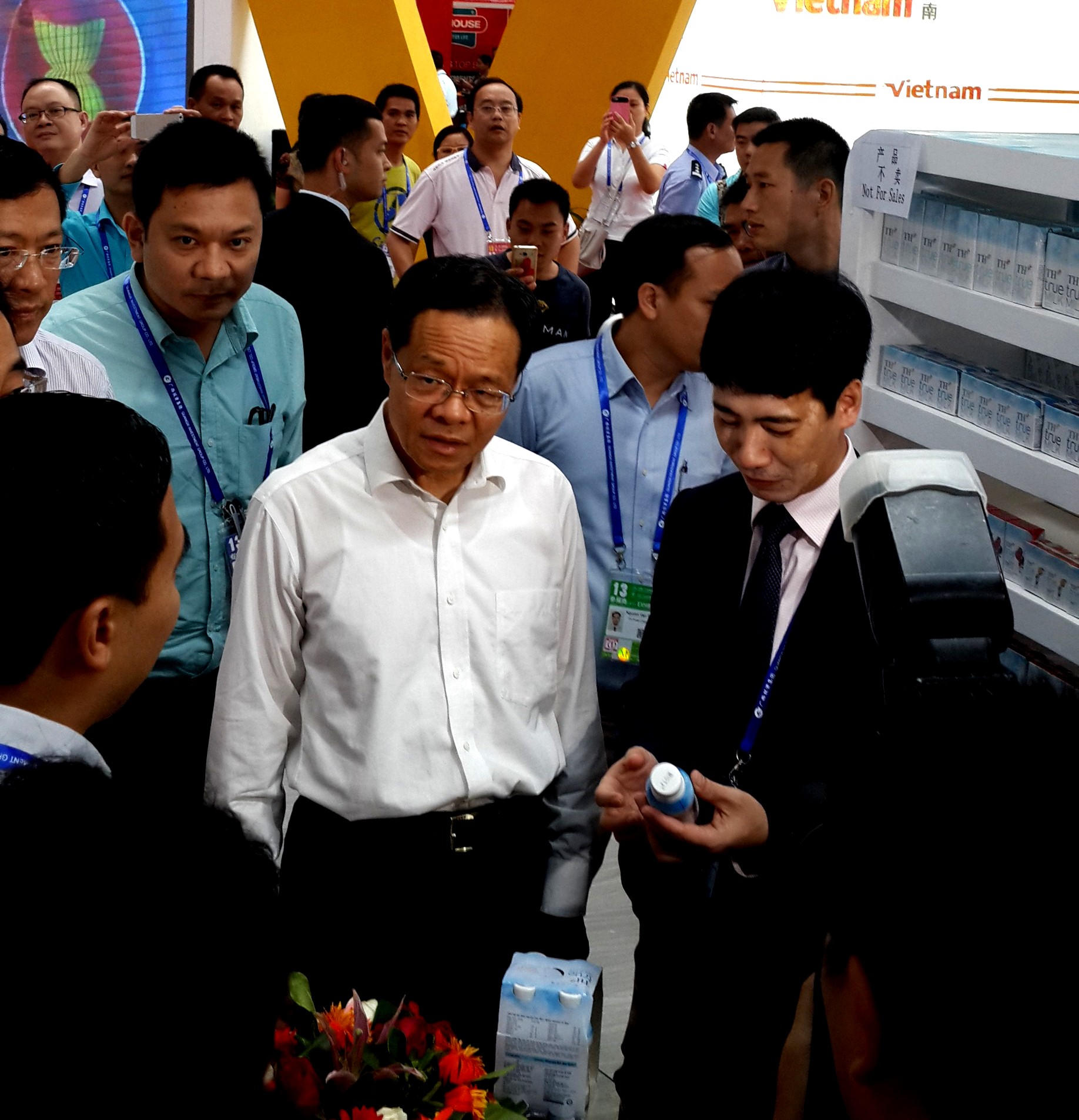 | Ông Trương Hiểu Khâm- Phó Chủ tịch tỉnh Quảng Tây tới thăm gian hàng TH True MILK, ăn thử sản phẩm tại gian hàng và mong muốn TH sớm có mặt tại tỉnh này |
