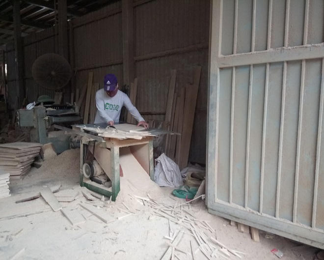Ông N.V.T, chủ xưởng mộc ở thôn Bò, xã Hữu Bằng cho biết: “Đặc trưng của nghề mộc là bụi gỗ, cắt cũng bụi, bào cũng bụi, đánh bóng cũng bụi nên đành chấp nhận, không biết làm sao cả. Gia đình tôi cũng đã đầu tư lắp hai quạt hút bụi nhưng không giải quyết được hết bụi gỗ.”