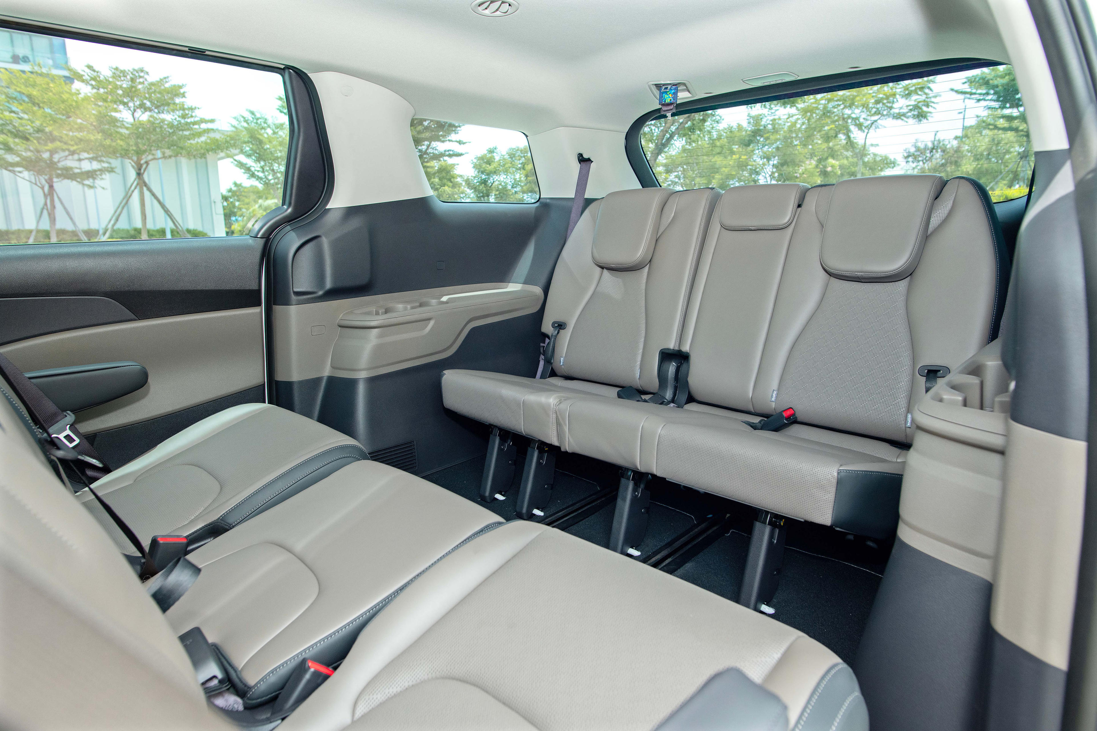 Bên cạnh đó, hàng ghế 3 trên Kia New Carnival được nhiều khách hàng đánh giá cao khi có thể điều chỉnh góc ngả lưng lên đến 120 độ hoặc gập phẳng giúp gia tăng không gian chứa đồ. Hàng ghế này có khoảng để chân rộng và khoảng sáng trần lớn, tạo không gian ngồi thông thoáng, thoải mái.