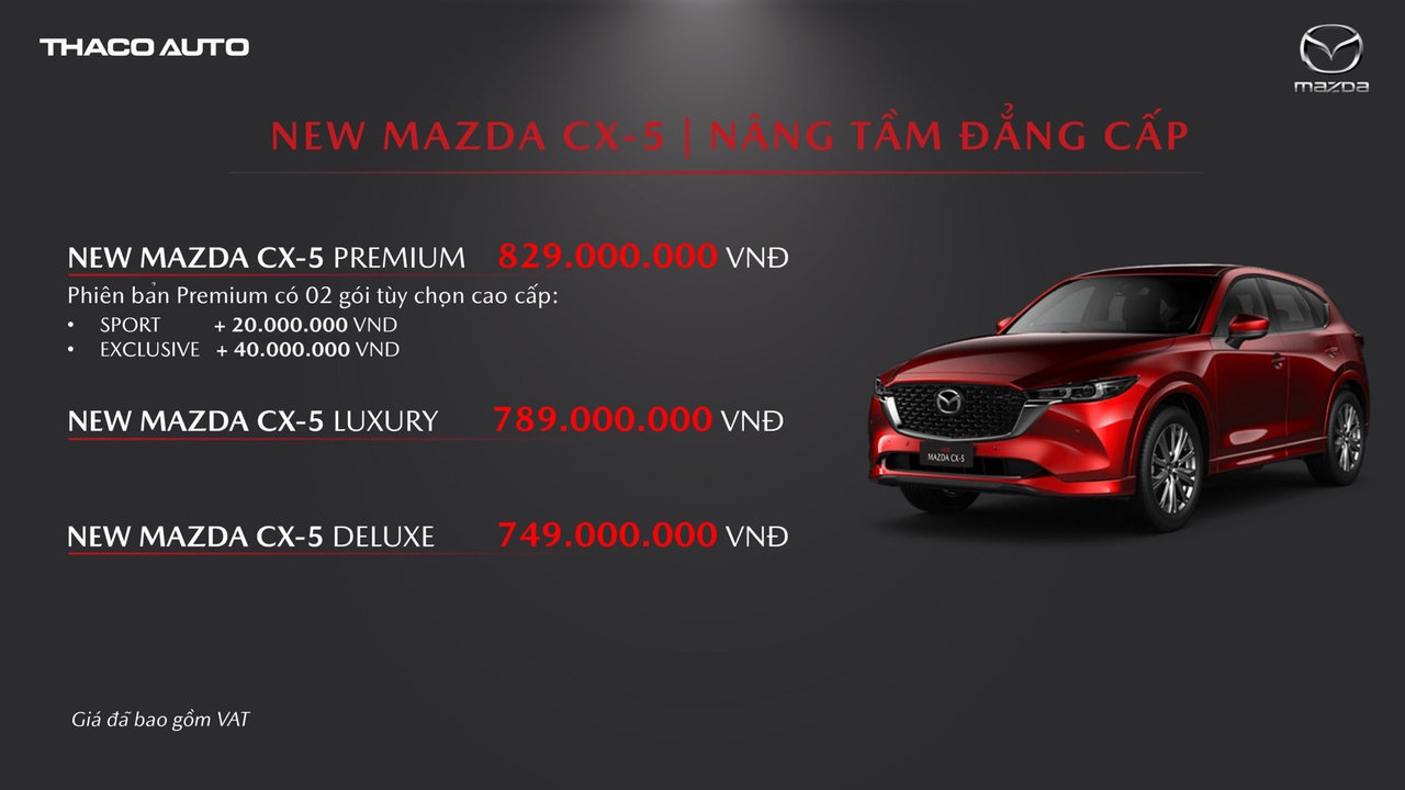 Tiếp nối sự thành công của Mazda CX-5, THACO AUTO tiếp tục giới thiệu đến khách hàng Việt Nam mẫu xe New Mazda CX-5 – mẫu SUV 5 chỗ đa dạng phiên bản với 2 gói tùy chọn.