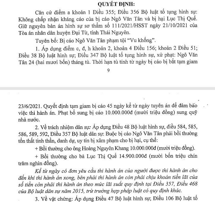 Ngày 23/6/2021, ông Ngô Văn Tân đã bị Công an huyện Đại Từ bắt tạm giam, tại Bản án số 111/2021/HSST ngày 21/10/2021 của Tòa án nhân dân huyện Đại Từ và Bản án số 55/2022/HSPT ngày 22/5/2022 của Tòa án nhân dân tỉnh Thái Nguyên đã xét xử ông Ngô Văn Tân 24 tháng tù giam về tội Vu khống về hành vi nêu trên, ngoài ra ông Tân bị phạt bổ sung 10 triệu đồng sung công quỹ. Về dân sự, bị cáo Tân có trách nhiệm bồi thường tổn thất tinh thần, danh dự, uy tín cho ông Hoàng Nguyên Khang số tiền 10 triệu đồng, bà Lục Thị Quế số tiền 14,9 triệu đồng.