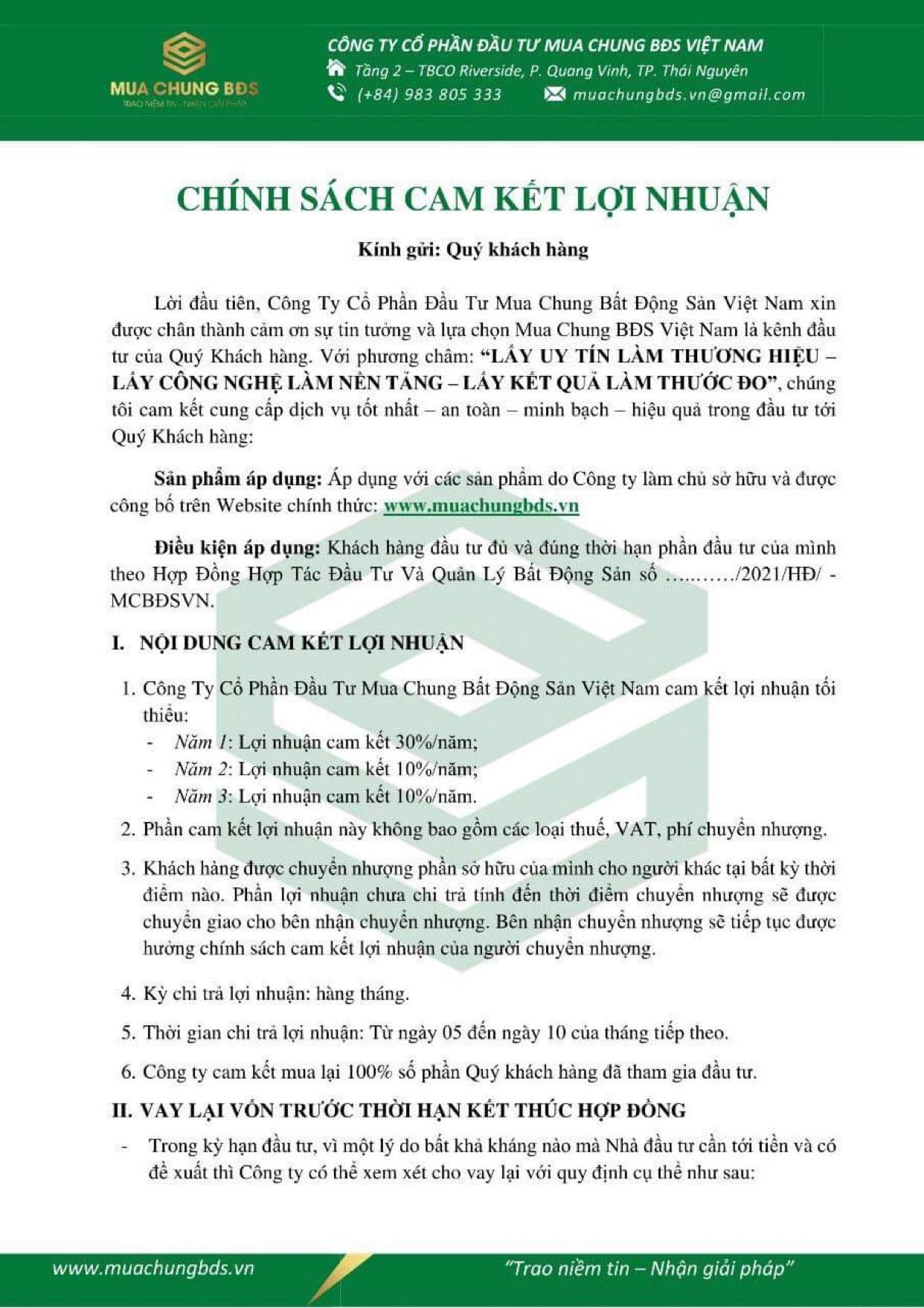 Theo một số thông tin quảng cáo, mời chào người nhà đầu tư của Công ty Cổ phần đầu tư mua chung bất động sản Việt Nam, khách hàng, nhà đầu tư tham gia đầu tư tiền càng nhiều thì phần thưởng nóng càng cao và trả lợi nhuận cam kết 30%/ năm.