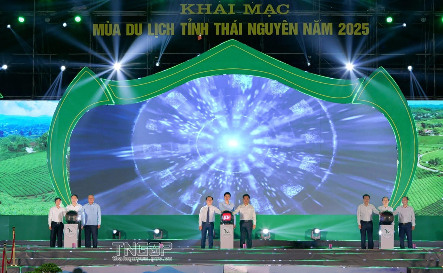 Các đại biểu thực hiện nghi thức bấm nút chính thức Khai mạc Mùa du lịch tỉnh Thái Nguyên năm 2025 tại quảng trường Vạn Xuân (TP. Phổ Yên), UBND tỉnh Thái Nguyên. |