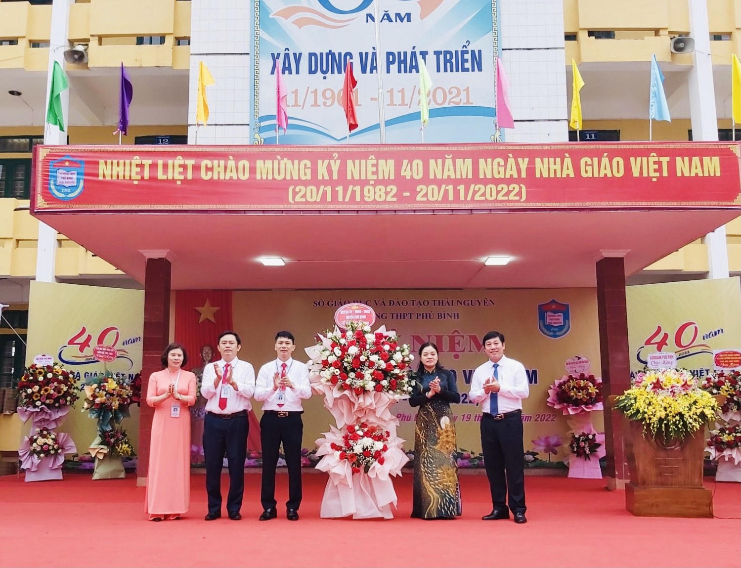 Lãnh đạo huyện Phú Bình tặng hoa chúc mừng các thầy, cô giáo trong buổi Lễ |