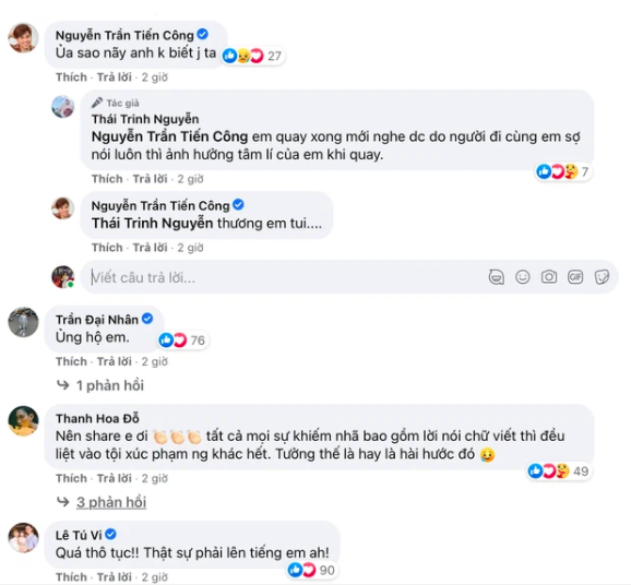 Đứng trước vấn đề này, dàn sao Việt đã đồng loạt phản ứng và cho thấy sự ủng hộ dành cho Thái Trinh. Đều là cánh chị em phụ nữ, Hari Won, Tú Vi và stylist Bông Chuẩn đồng ý với bài đăng lên án của nữ ca sĩ này. Còn Tiến Công bất ngờ khi biết được vụ việc dù cách đó vài tiếng vì cả hai đã cùng xuất hiện trên gameshow này, anh có mặt tại địa điểm diễn ra vụ việc hôm đó. Đến đây, Thái Trinh phải đính chính rằng bản thân cô cũng phải quay xong chương trình mới nghe được câu chuyện. Người tiết lộ sợ nói ra chuyện này với Thái Trinh luôn thì sẽ ảnh hưởng đến tâm lý của tập thể ekip hôm đó.
