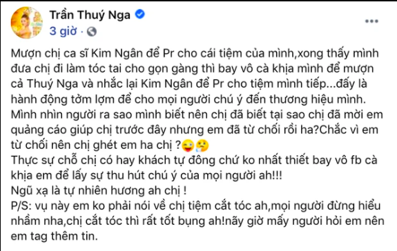 Nguyên văn chia sẻ của danh hài Thuý Nga như sau: "Mượn ca sĩ Kim Ngân để PR cho cái tiệm của mình. Xong thấy Nga đưa ca sĩ Kim Ngân đi làm tóc tai cho gọn gàng thì bay vô cà khịa, mượn cả Thúy Nga và nhắc lại Kim Ngân để PR cho tiệm mình tiếp. Đấy là hành động tởm lợm để cho mọi người chú ý đến thương hiệu mình. Nga nhìn người ra sao Nga biết, nên chị đã biết tại sao chị mời Nga quảng cáo giúp chị trước đây nhưng Nga đã từ chối rồi ha? Chắc vì Nga từ chối nên chị ghét Nga ha chị? Thực sự chỗ chị có hay thì khách tự đông, chứ không nhất thiết bay vô Facebook cà khịa em để thu hút chú ý của mọi người. Hữu xạ tự nhiên hương nha chị".
