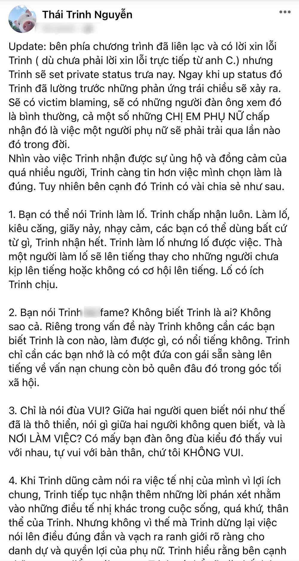 Cụ thể, nữ ca sĩ chia sẻ chương trình đã liên lạc với cô và gửi lời xin lỗi nhưng phía người quay phim vẫn chưa lên tiếng. Thái Trinh lường trước rằng khi đăng tải bài viết tố cáo quấy rối đó sẽ có nhiều phản ứng trái chiều nhưng không thể tin rằng có rất nhiều ý kiến cho đó là bình thường.