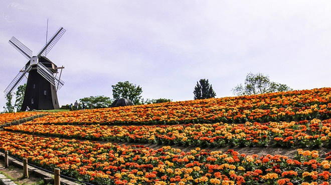 Một góc công viên với vườn hoa và cối xay gió gợi khung cảnh về đất nước Hà Lan.