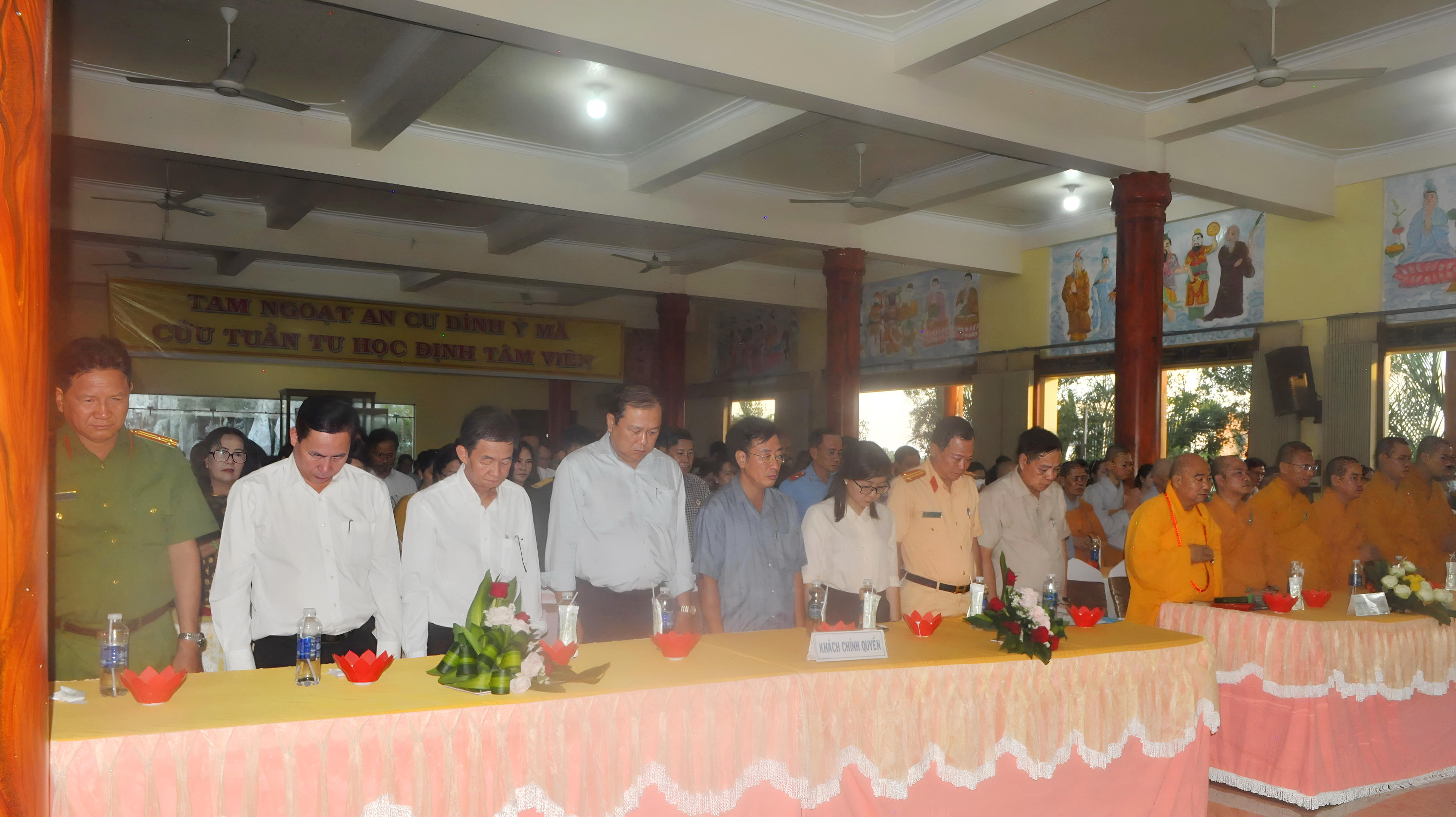 Các đại biểu mặc niệm cầu siêu cho các nạn nhân tử vong do tai nạn giao thông năm 2023 được diễn ra tại chùa Kim Sơn (khóm 8, phường 6, TP Cà Mau, tỉnh Cà Mau). |