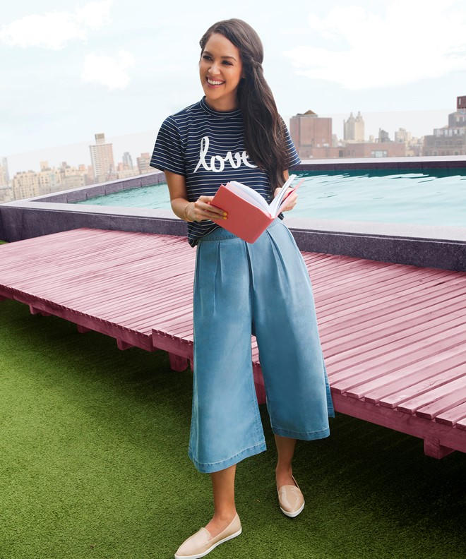 Để che nắng cho đôi chân, bạn có thể chọn quần lửng ống loe denim kết hợp cùng áo cộc tay sáng màu. Một đôi giày cao gót mũi nhọn sẽ tăng thêm sự thanh lịch cho cả set đồ.