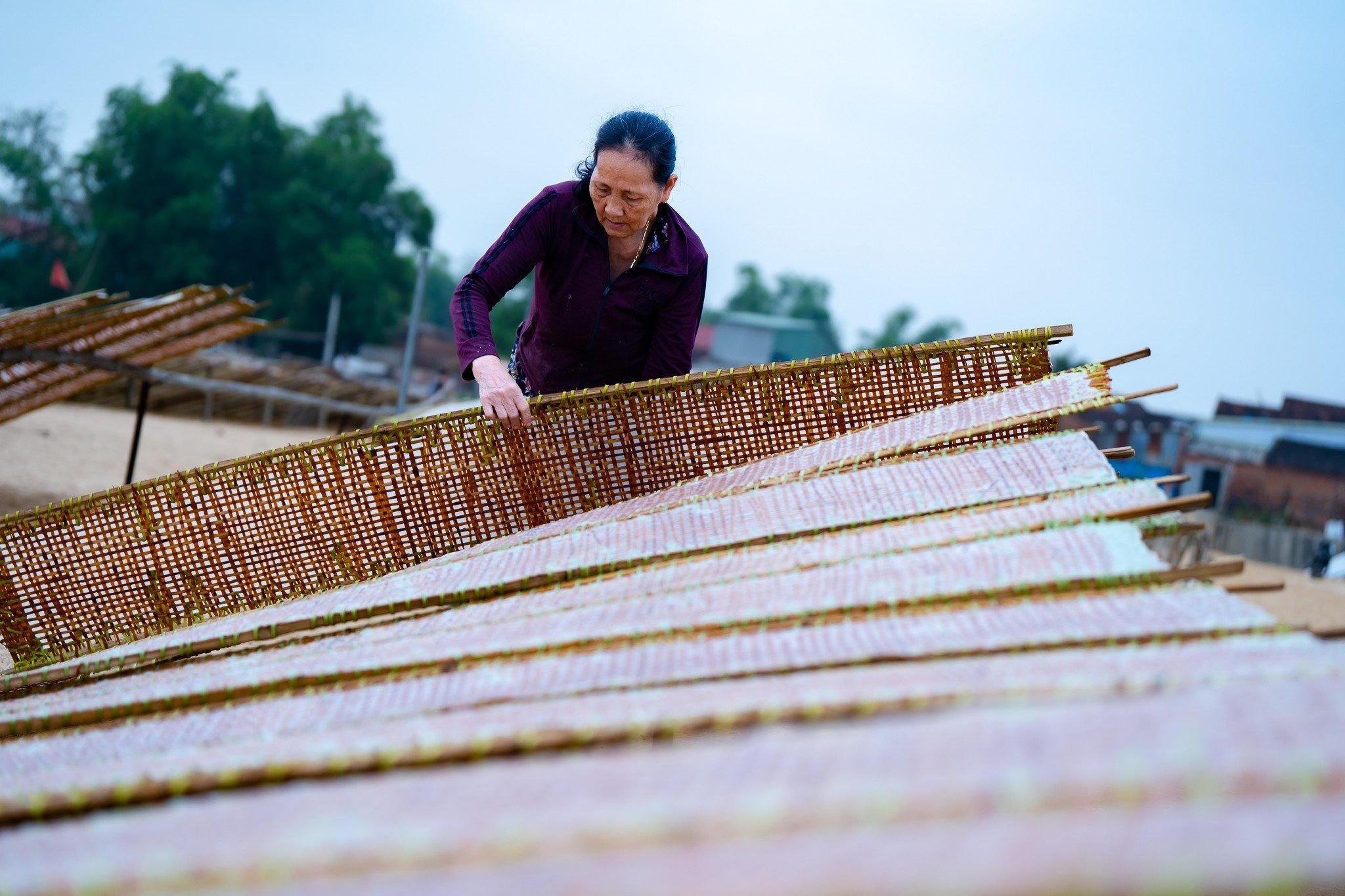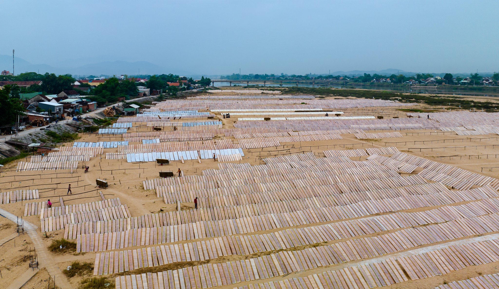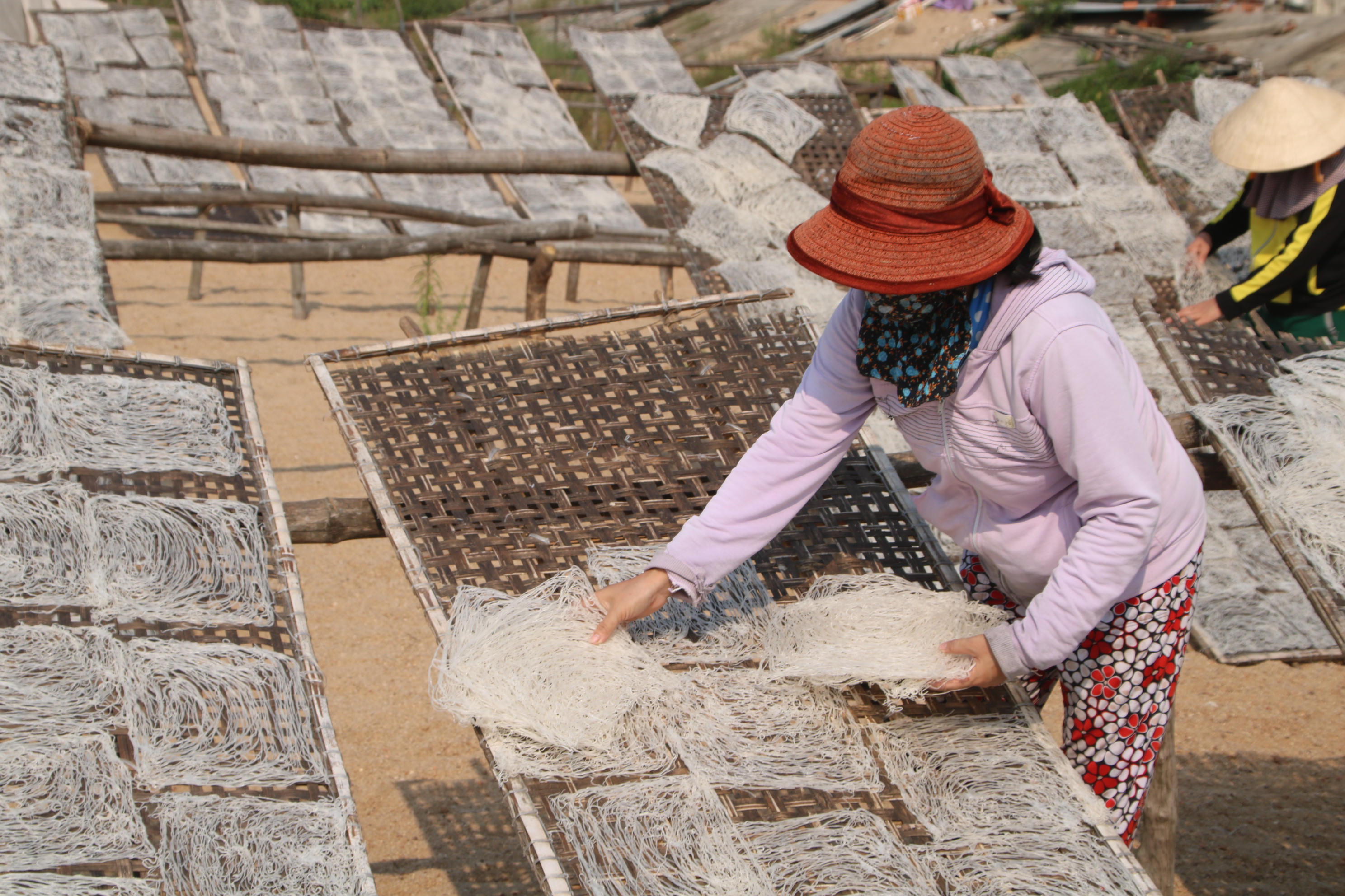 Từ tờ mờ sáng, các thợ làm bánh, bún đã nhóm lửa, xay bột, đúc khuôn bánh, bún cho ra những sợi bún gạo, mì trắng mượt mà, những chiếc bánh tráng dài như miếng dải lụa mềm mại, rồi đưa lên vỉ tre phơi nắng trên bãi cát vàng nằm bên bờ sông Kôn (ảnh: Dũng Nhân).