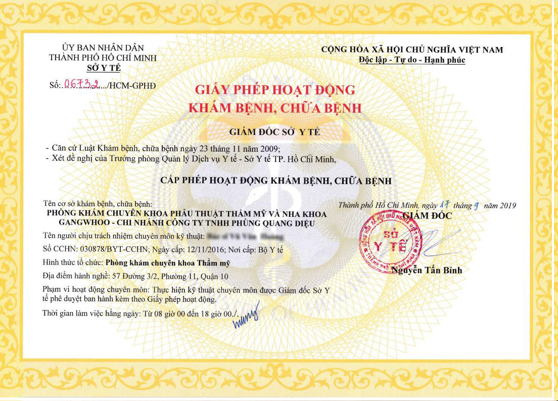 Thẩm mỹ viện Gangwhoo được Sở Y tế TP.Hồ Chí Minh cấp Giấy phép hoạt động khám bệnh, chữa bệnh Số 06732 ngày 17/9/2019. Người ký Giấy phép hoạt động là Giám đốc Sở Y tế TP.Hồ Chí Minh – Ông Nguyễn Tấn Bỉnh.