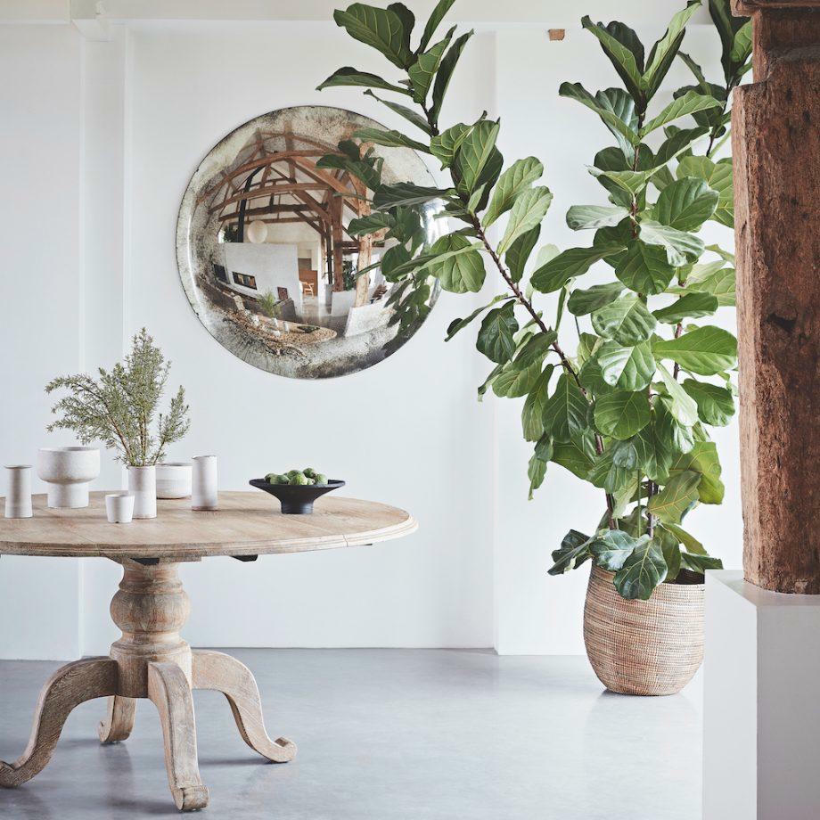 Một chiếc bàn tròn và gương cầu lồi được đặt cạnh một chậu cây lớn, tạo ra một mảng tán lá ấn tượng trên nền tường trắng và là một cách đơn giản để đưa thiên nhiên vào nhà. Chủ sở hữu cho biết: "Tôi không biết cây cối có thể làm dịu không gian nhiều đến vậy, cho đến khi tôi bắt đầu mua nhiều cây”.