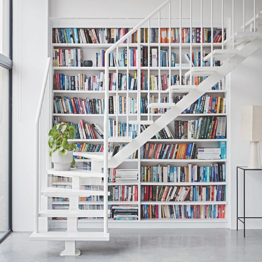 Giá sách kế bên cầu thang dẫn lên phòng làm việc tại nhà