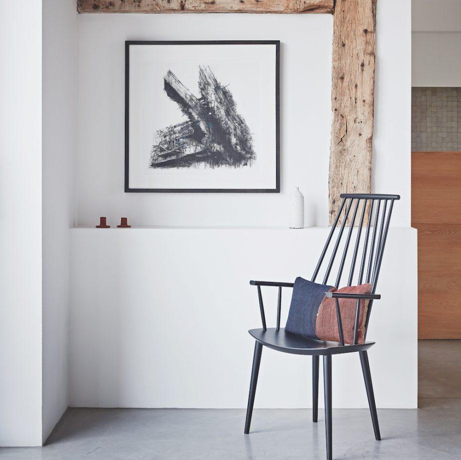 Trưng bày những tác phẩm nghệ thuật giúp cho ngôi nhà thêm phần sang trọng và bắt mắt. Việc sử dụng những bức tranh với 2 màu đen và trắng làm nổi bật nhưng cũng hài hòa với các dầm gỗ sồi cũ của nhà kho.