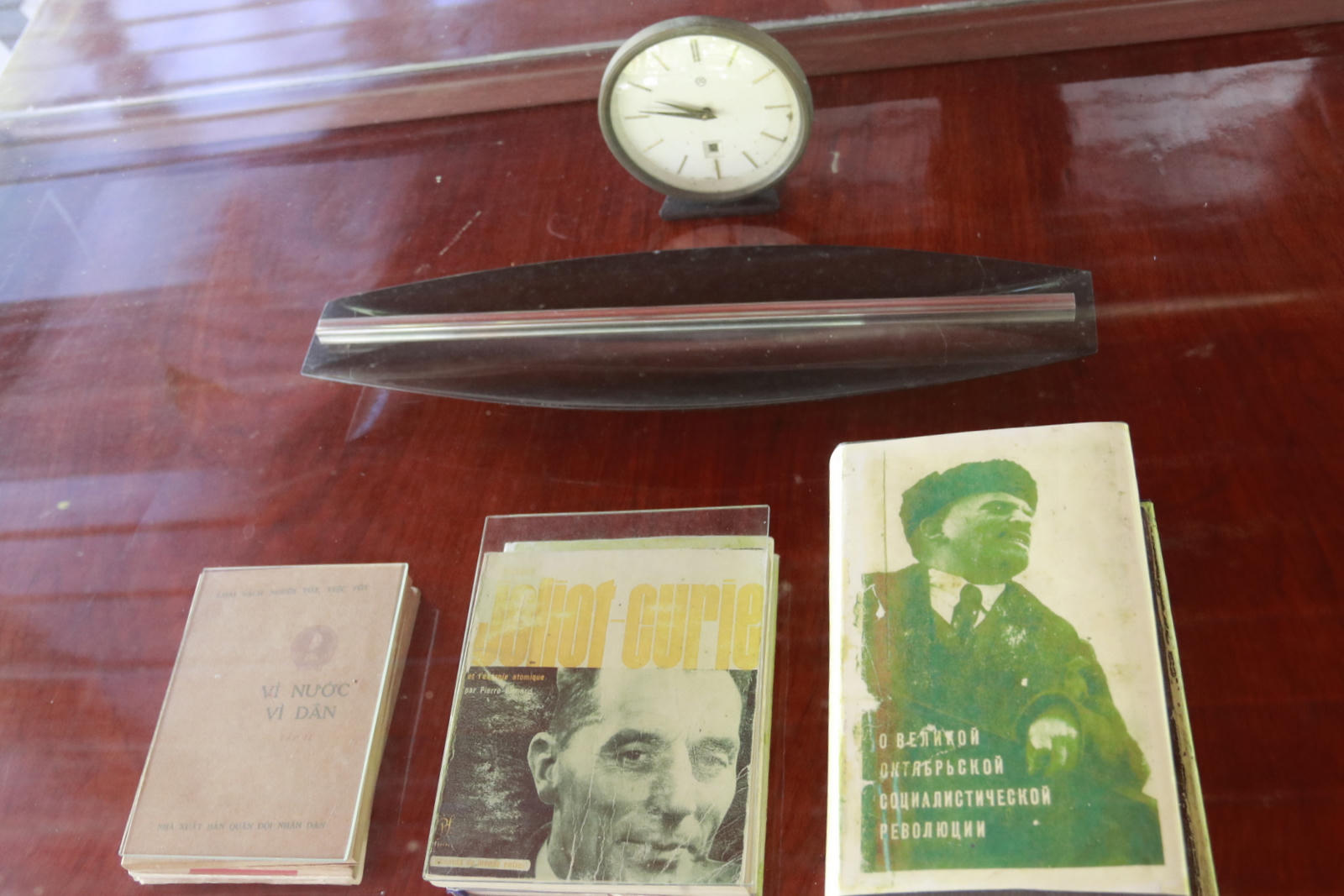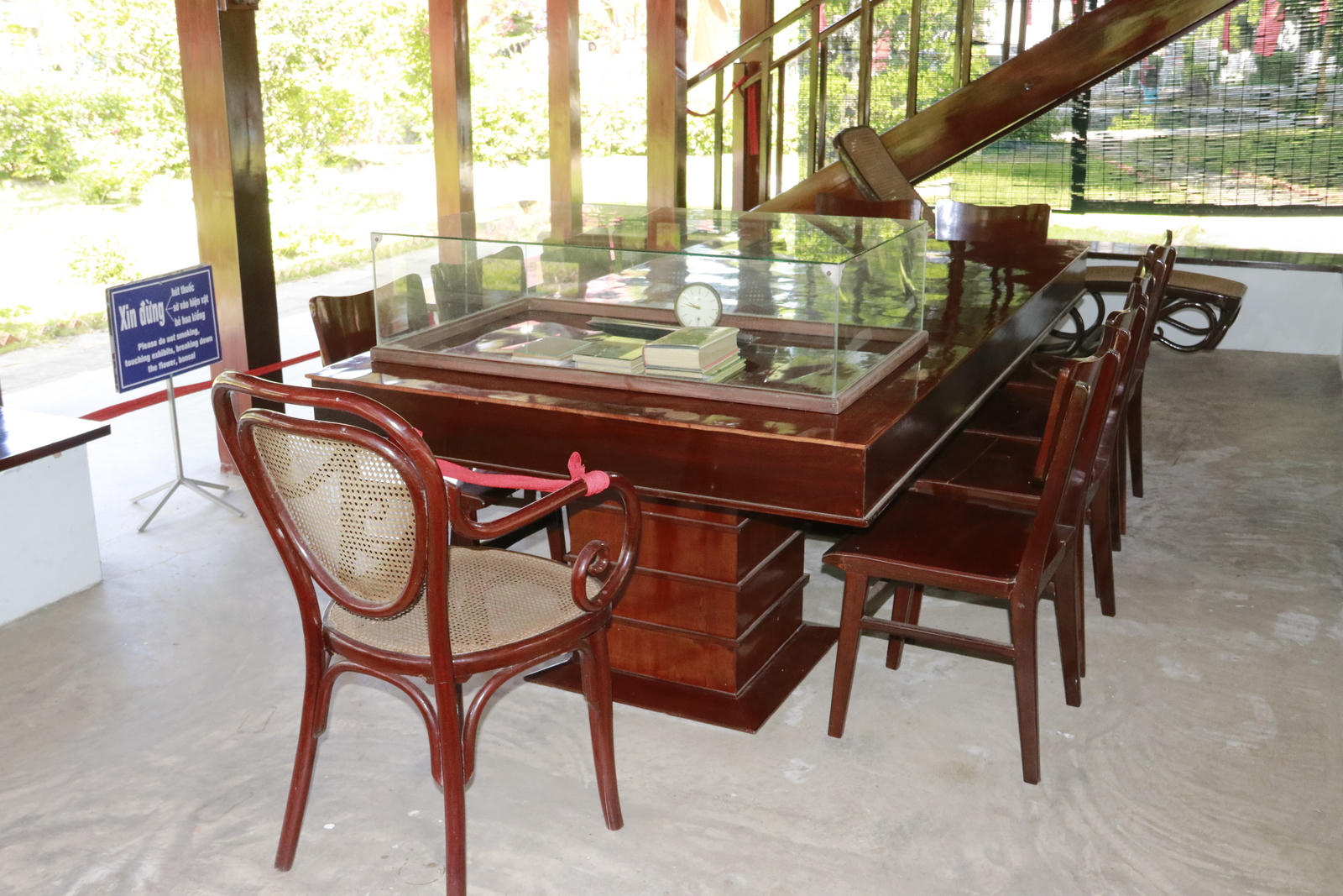 Đặc biệt, nếu ở nhà sàn trong Phủ Chủ tịch, chiếc đồng hồ Bác xem giờ vẫn chạy đều như thể Bác vẫn còn sống thì chiếc đồng hồ ở đây được để dừng lại lúc 9 giờ 47 phút – giờ phút Bác ra đi mãi mãi. Ở đây còn có chiếc ghế mây dài để Bác nằm nghỉ lưng. Cạnh đó là một chiếc bàn nhỏ gần cầu thang đặt ba máy điện thoại để Bác thường xuyên nhận tin tức ở đơn vị chiến đấu và kịp thời động viên khen thưởng các đơn vị xuất sắc. Bên cạnh là chiếc mũ sắt Bác dùng để tránh đạn và bom bi.