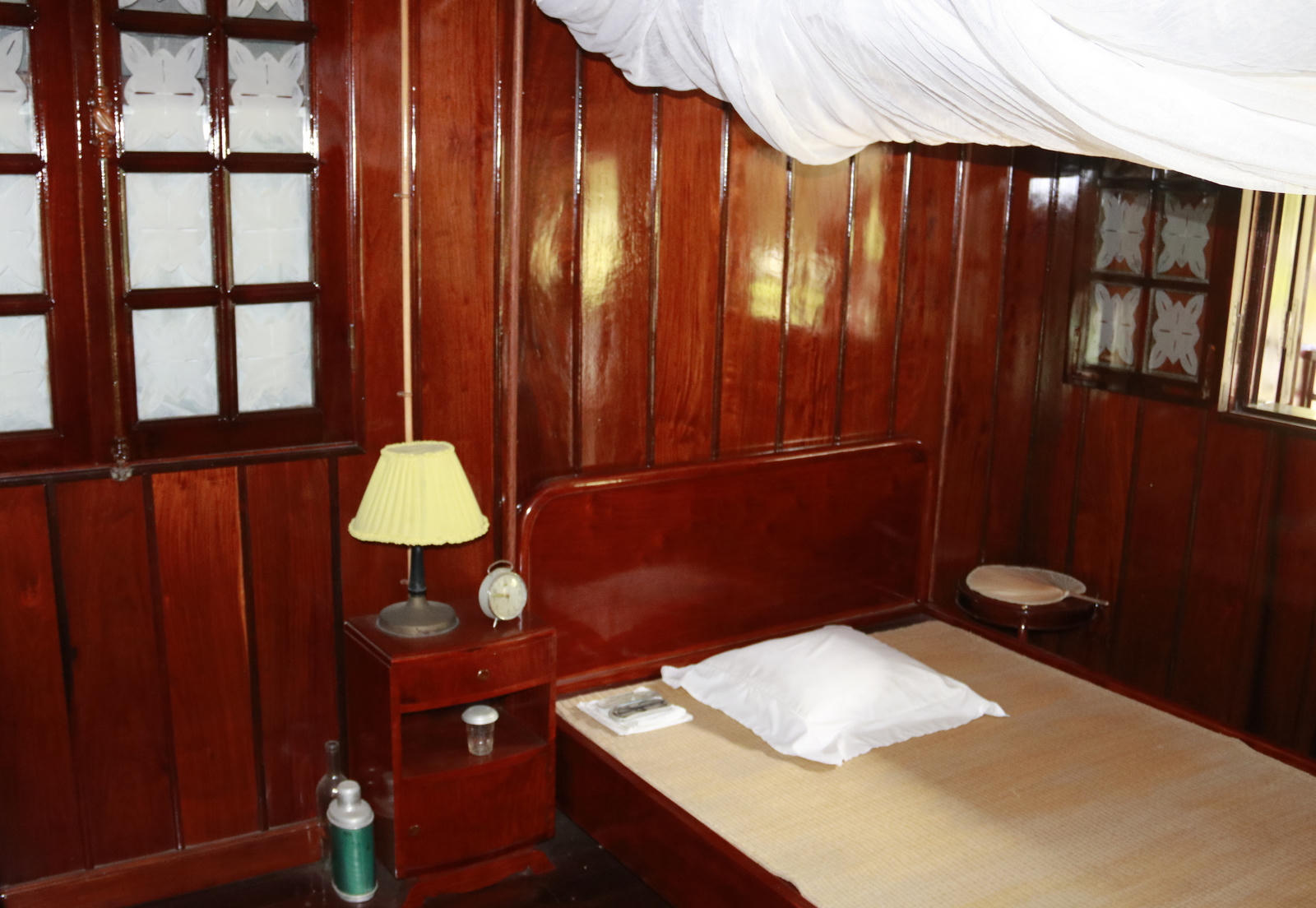 Trong phòng ngủ phục dựng lại y hệt những thứ cần thiết cho sinh hoạt hàng ngày của Bác. Chiếc giường mộc mạc đơn sơ. Góc trên giường vẫn thấy chiếc quạt tay được làm bằng lá cọ và chổi xua ruồi, muỗi. Cạnh tủ nhỏ là một phích nước và chai nước lọc, mỗi khi khách đến Bác đã dùng một ít nước uống trong phích và pha thêm một ít nước nguội trong chai để uống liền mà không mất thời gian chờ đợi. Chiếc radio trên bàn là quà tặng của một kiều Thái Lan tặng Bác. Bác đã nhận để đáp lại tình cảm của đồng bào ta ở nước ngoài luôn hướng về tổ quốc. Người vô cùng xúc động khi nghe các cháu thiếu nhi hát những bài ca về miền Nam. Chiếc mũ vải bạc màu Bác thường đội khi đi thăm các đơn vị, địa phương ở miền Bắc.