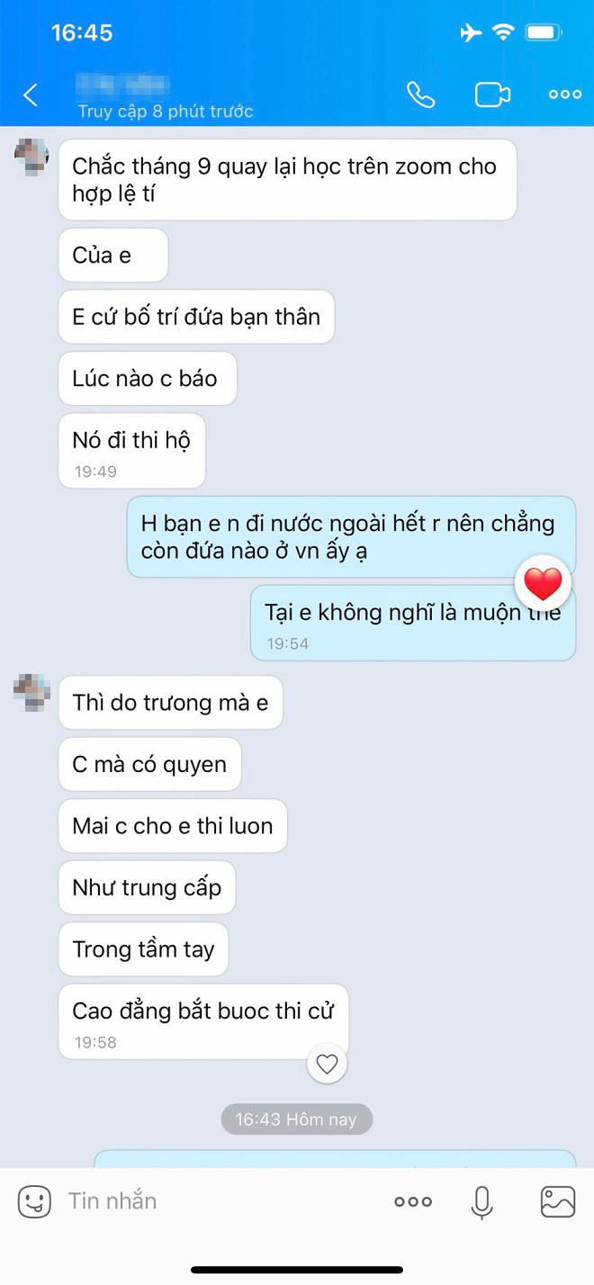 Trong khi chờ đợi đề thi cao đẳng như hứa hẹn, vì lịch thi bị lùi do dịch Covid -19, Đ bày tỏ lo ngại không lấy được bằng trước khi quay lại Hàn Quốc. “Em nói kế hoạch của em là tháng 9 bay, chị ấy chắc chắn với em là có. Khi nhắn chị ấy nói phải học zoom cho hợp lệ. Nếu em đã qua Hàn thì nói đứa bạn thân đi thi hộ”, Đ thuật lại.