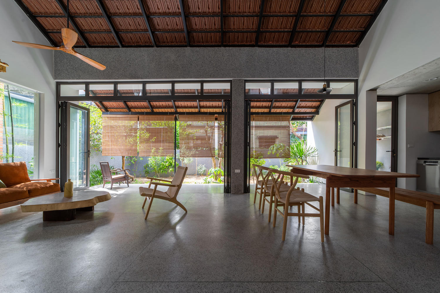 Với việc bố trí không gian theo từng lớp, các kiến trúc sư đã tạo nên chiều sâu cho không gian ngôi nhà. Khối không gian sinh hoạt chung là trung tâm được mở ra để tối ưu việc thông gió tự nhiên qua các hiên dài, ánh sáng tự nhiên len lỏi vào không gian vừa phải, phù hợp với không gian sống. Tầng 2 được thiết kế tối giản các khối phòng ngủ và khối không gian phụ trợ, giúp tối ưu hóa diện tích sử dụng. Hai khối chức năng này được nối với nhau bằng một hệ thống cầu thang sắt, và cầu thang gỗ, tạo trải nghiệm thú vị khi di chuyển.