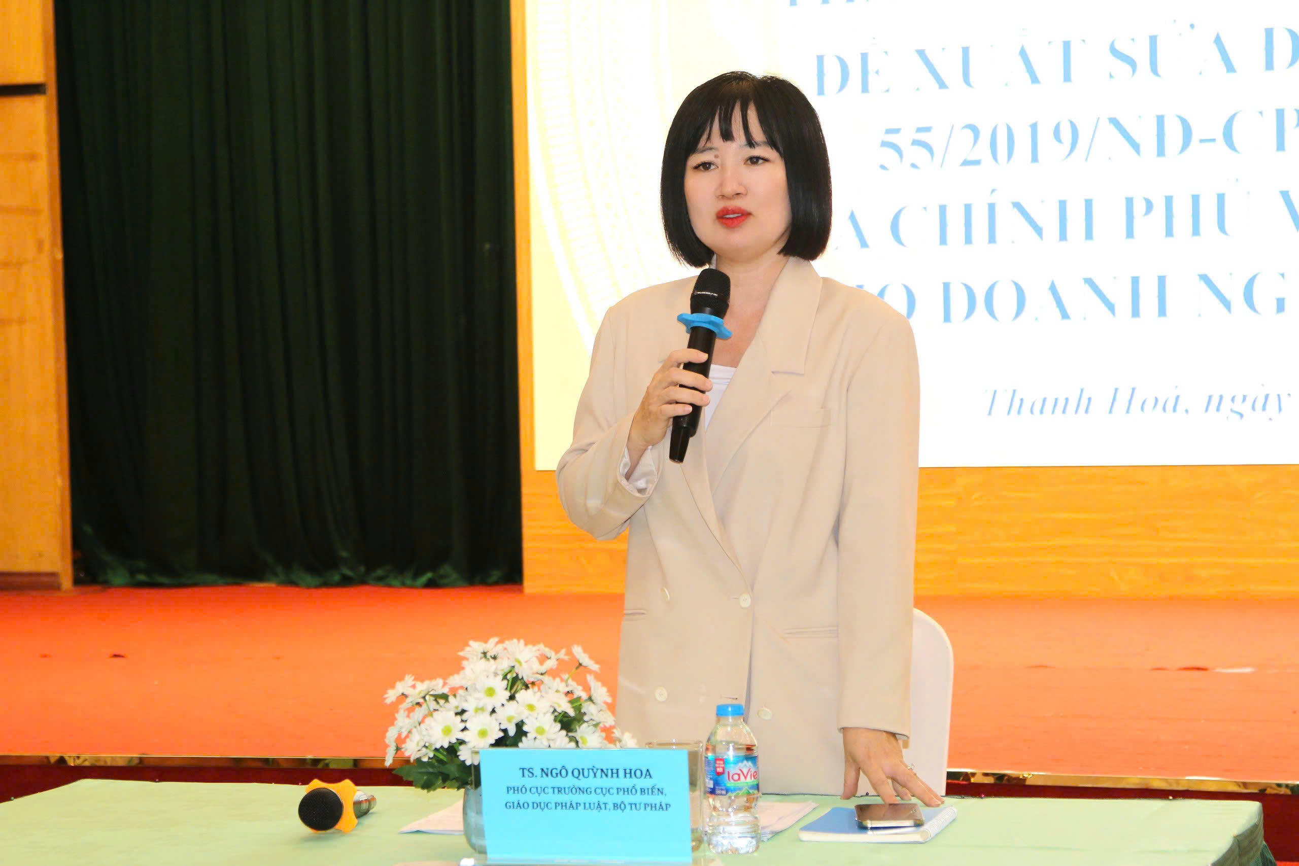 Phát biểu tại hội thảo, Tiến sĩ Ngô Quỳnh Hoa, Phó Cục Trưởng Cục Phổ biến giáo dục pháp luật, nhấn mạnh: Qua tổng kết 5 năm thực hiện Nghị định 55/2019/NĐ-CP và kết quả tổ chức các hoạt động về hỗ trợ pháp lý cho doanh nghiệp nhỏ và vừa cho thấy, một số quy định của Nghị định 55 bộc lộ bất cập, hạn chế khiến các doanh nghiệp, tổ chức đại diện của doanh nghiệp còn khó khăn khi tiếp cận các chính sách hỗ trợ của Nhà nước.